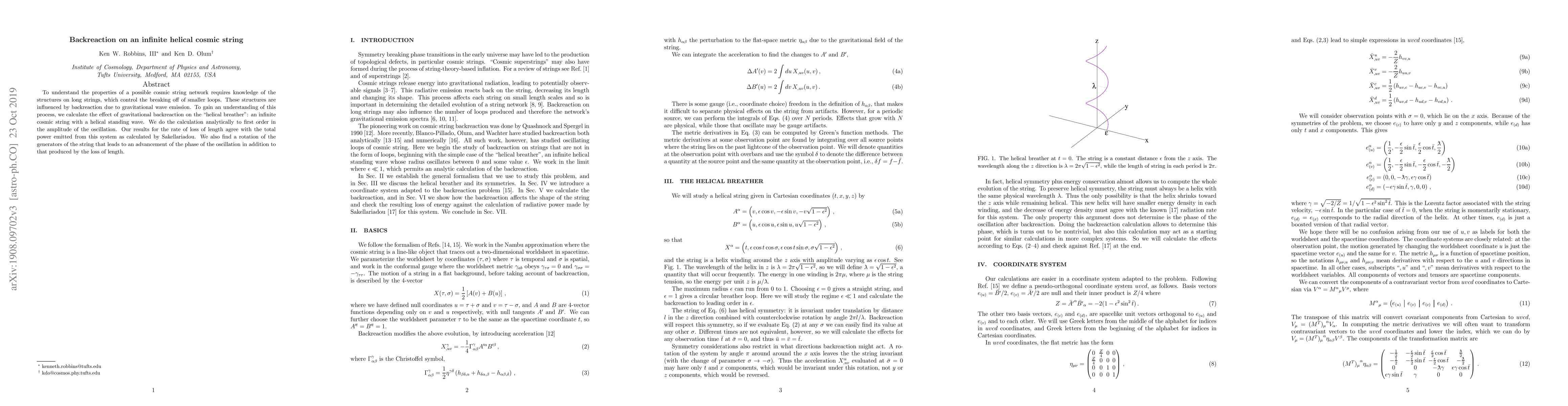 The paper presents detailed analytical calculations of gravitational backreaction on helical cosmic strings, providing insights into the loss of string length and associated rotations.