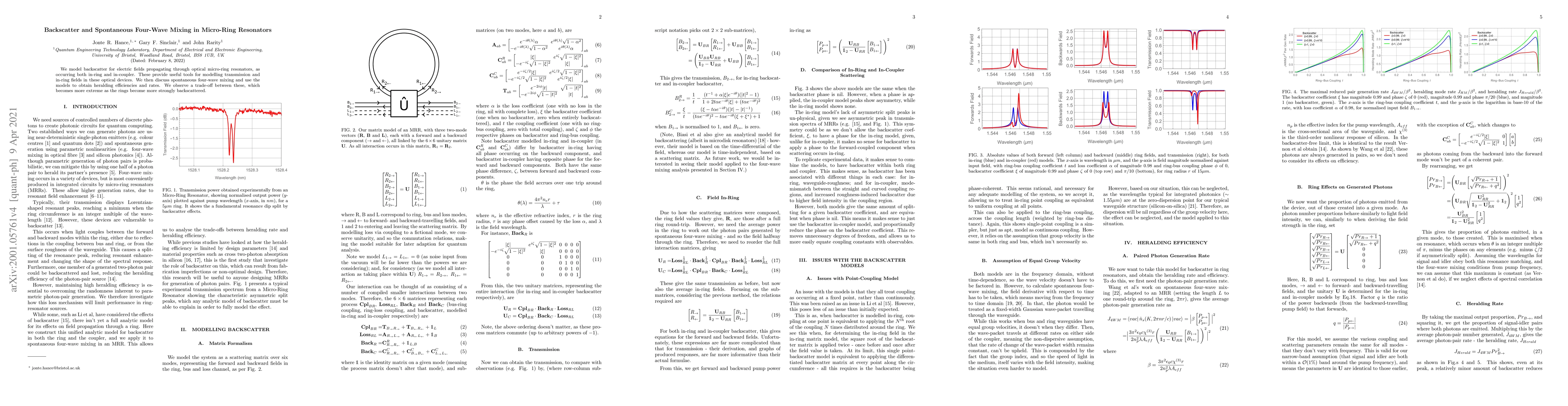 We model backscatter for electric fields propagating through optical micro-ring resonators, as occurring both in-ring and in-coupler. These provide useful tools for modelling transmission and in-ring fields in these optical devices. We then discuss spontaneous four-wave mixing and use the models to obtain heralding efficiencies and rates. We observe a trade-off between these, which becomes more extreme as the rings become more strongly backscattered.