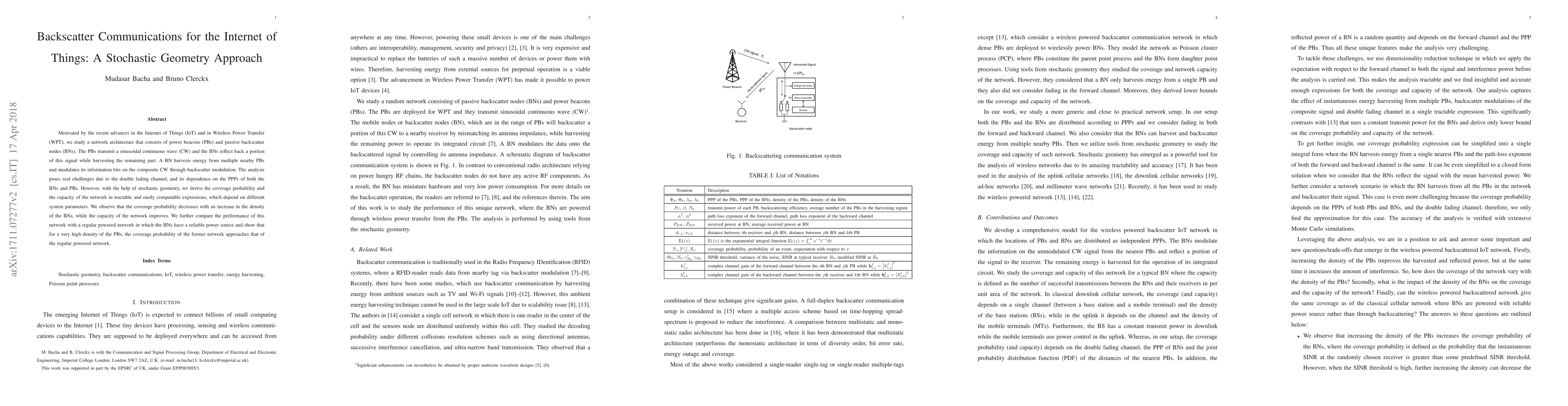 Motivated by the recent advances in the Internet of Things (IoT) and in Wireless Power Transfer (WPT), we study a network architecture that consists of power beacons (PBs) and passive backscatter nodes (BNs). The PBs transmit a sinusoidal continuous wave (CW) and the BNs reflect back a portion of this signal while harvesting the remaining part. A BN harvests energy from multiple nearby PBs and modulates its information bits on the composite CW through backscatter modulation. The analysis poses real challenges due to the double fading channel, and its dependence on the PPPs of both the BNs and PBs. However, with the help of stochastic geometry, we derive the coverage probability and the capacity of the network in tractable and easily computable expressions, which depend on different system parameters. We observe that the coverage probability decreases with an increase in the density of the BNs, while the capacity of the network improves. We further compare the performance of this network with a regular powered network in which the BNs have a reliable power source and show that for a very high density of the PBs, the coverage probability of the former network approaches that of the regular powered network.