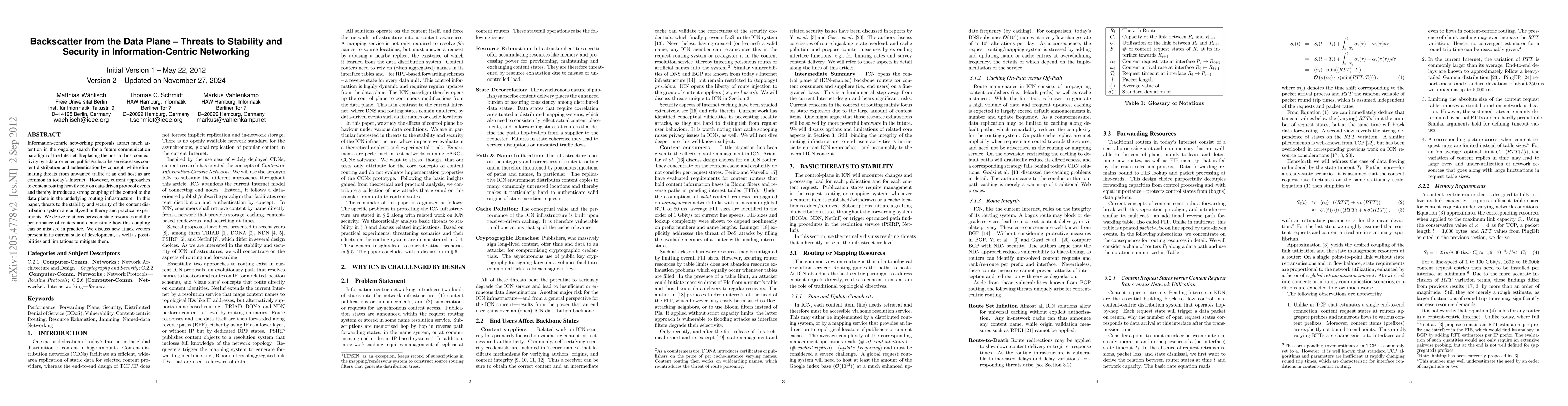 This paper analyzes threats to stability and security in information-centric networking, focusing on the coupling between control and data planes. It identifies new attack vectors and discusses mitigation possibilities, demonstrating the risks through theoretical and practical experiments.