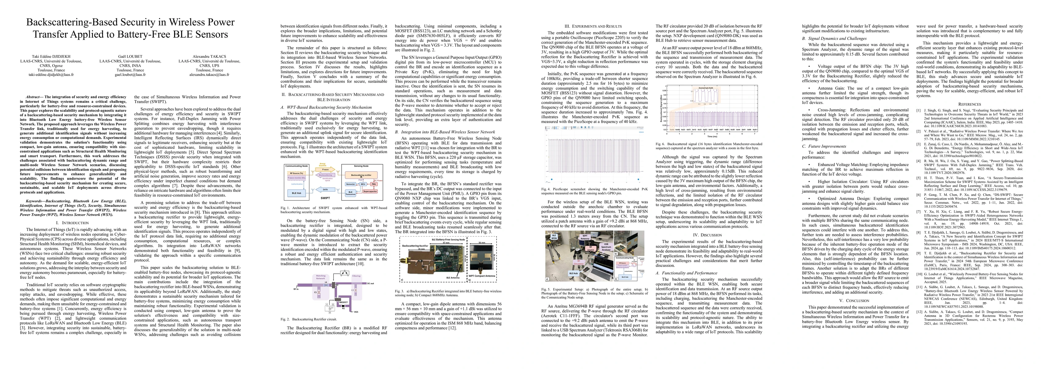The integration of security and energy efficiency in Internet of Things systems remains a critical challenge, particularly for battery-free and resource-constrained devices. This paper explores the scalability and protocol-agnostic nature of a backscattering-based security mechanism by integrating it into Bluetooth Low Energy battery-free Wireless Sensor Network. The proposed approach leverages the Wireless Power Transfer link, traditionally used for energy harvesting, to generate additional identification signals without increasing energy consumption or computational demands. Experimental validation demonstrates the solution's functionality using compact, low-gain antenna, ensuring compatibility with size-constrained applications such as Structural Health Monitoring and smart transport. Furthermore, this work addresses the challenges associated with backscattering dynamic range and multi-node Wireless Sensor Network scenarios, discussing potential collisions between identification signals and proposing future improvements to enhance generalizability and scalability. The findings underscore the potential of the backscattering-based security mechanism for creating secure, sustainable, and scalable IoT deployments across diverse protocols and applications.