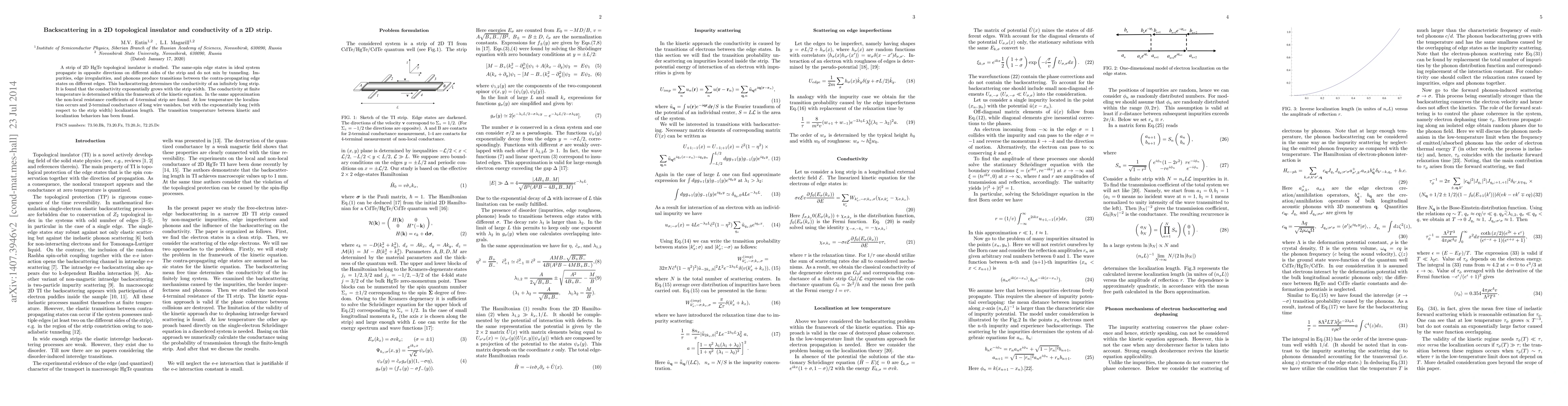 A strip of 2D HgTe topological insulator is studied. The same-spin edge states in ideal system propagate in opposite directions on different sides of the strip and do not mix by tunneling. Impurities, edge irregularities, and phonons produce transitions between the contra-propagating edge states on different edges. This backscattering determines the conductivity of an infinitely long strip. It is found that the conductivity exponentially grows with the strip width. The conductivity at finite temperature is determined within the framework of the kinetic equation. In the same approximation the non-local resistance coefficients of 4-terminal strip are found. At low temperature the localization occurs and 2-terminal conductance of long wire vanishes, but with the exponentially long (with respect to the strip width) localization length. The transition temperature between kinetic and localization behaviors has been found.