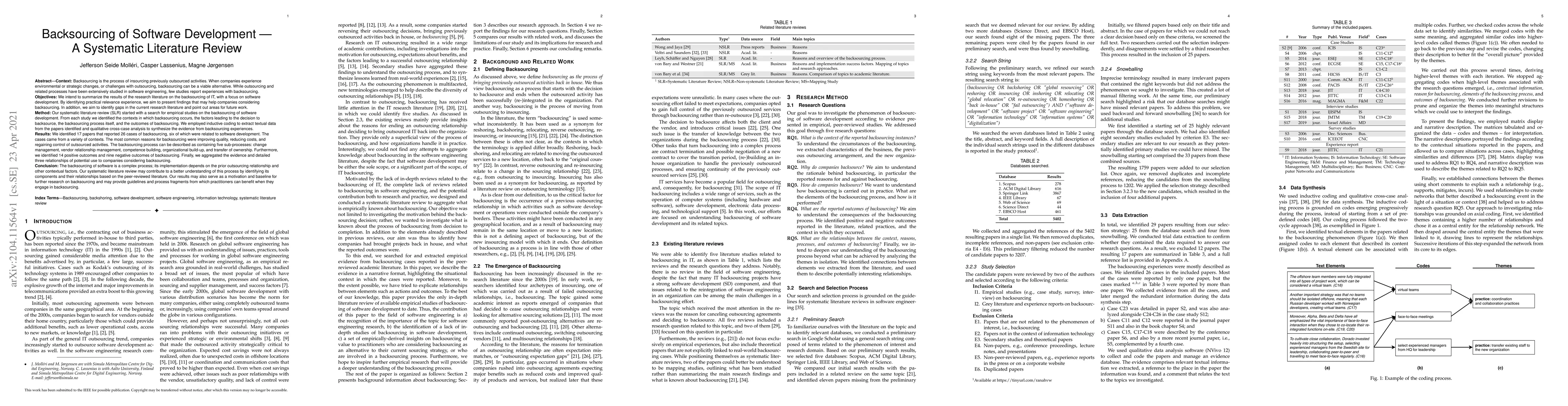 This systematic literature review summarizes research on backsourcing in software development, identifying 17 studies detailing 26 backsourcing cases, six of which focused on software. The primary reasons for backsourcing included improving quality, reducing costs, and regaining control. The process involved five sub-processes: change management, vendor relationship management, competence building, organizational build-up, and transfer of ownership.