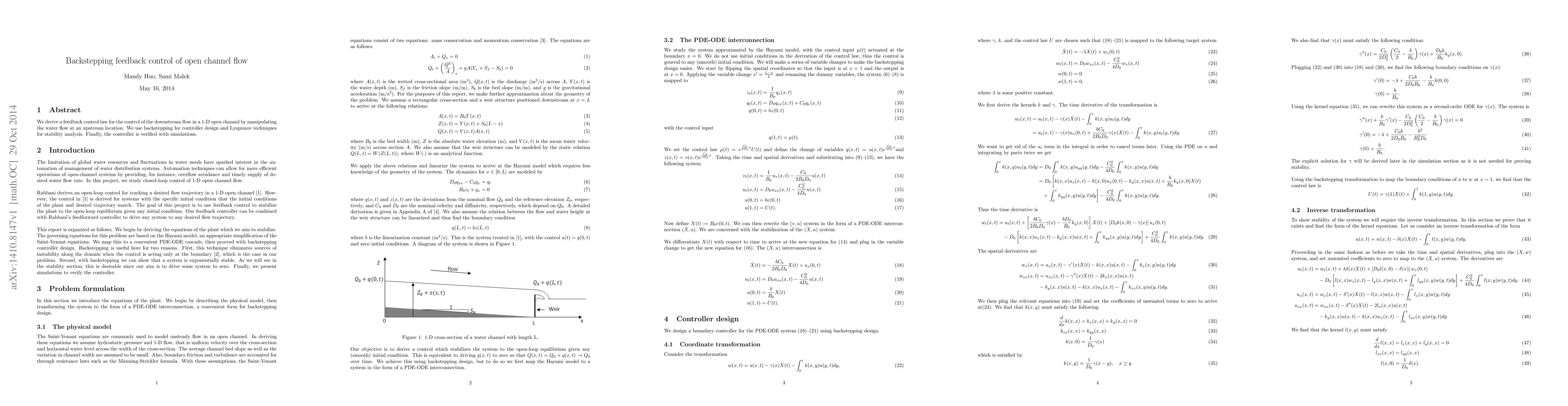 We derive a feedback control law for the control of the downstream flow in a 1-D open channel by manipulating the water flow at an upstream location. We use backstepping for controller design and Lyapunov techniques for stability analysis. Finally, the controller is verified with simulations.