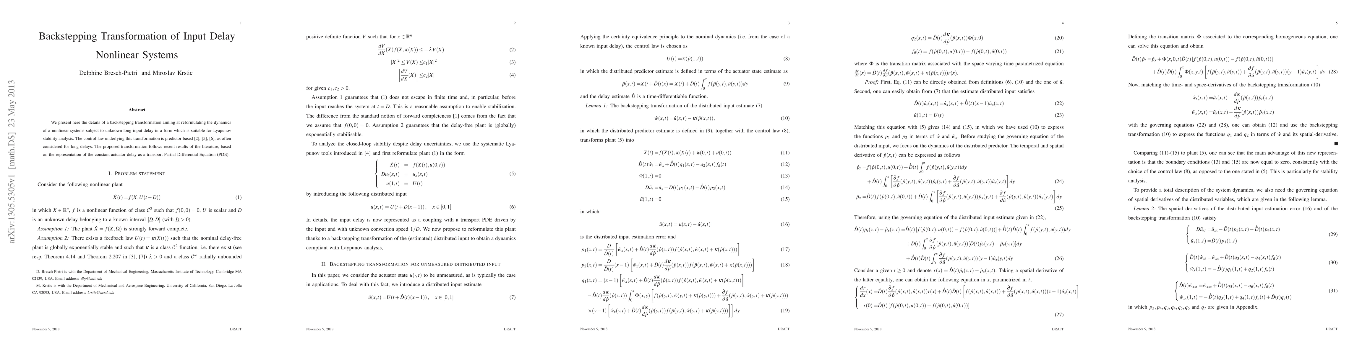 We present here the details of a backstepping transformation aiming at reformulating the dynamics of a nonlinear systems subject to unknown long input delay in a form which is suitable for Lyapunov stability analysis. The control law underlying this transformation is predictor-based, as often considered for long delays. The proposed transformation follows recent results of the literature, based on the representation of the constant actuator delay as a transport Partial Differential Equation (PDE).