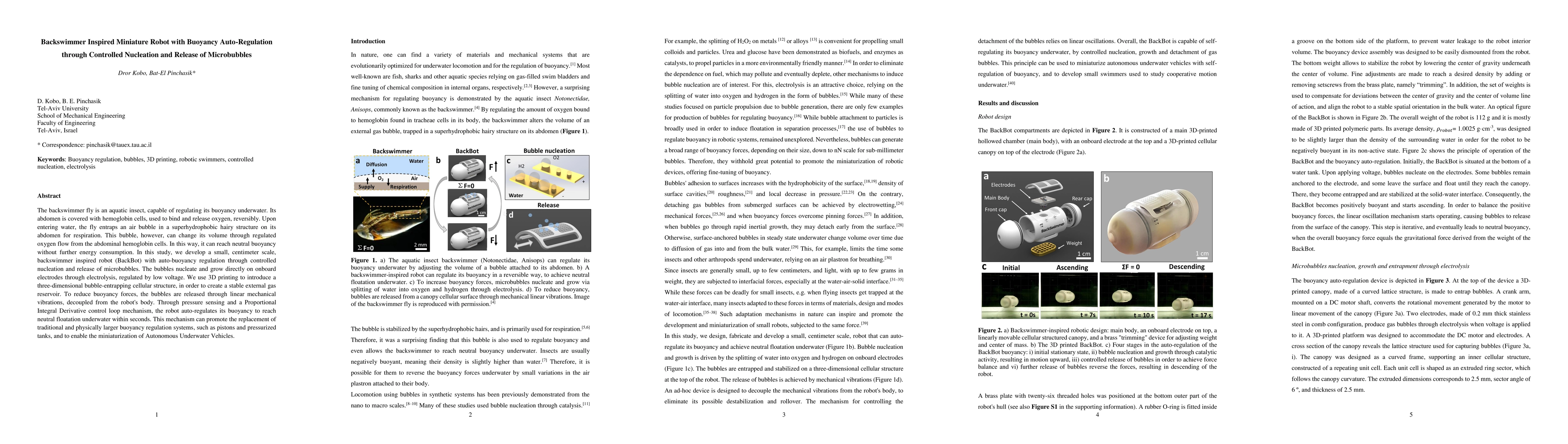 The backswimmer fly is an aquatic insect, capable of regulating its buoyancy underwater. Its abdomen is covered with hemoglobin cells, used to bind and release oxygen, reversibly. Upon entering water, the fly entraps an air bubble in a superhydrophobic hairy structure on its abdomen for respiration. This bubble, however, can change its volume through regulated oxygen flow from the abdominal hemoglobin cells. In this way, it can reach neutral buoyancy without further energy consumption. In this study, we develop a small, centimeter scale, backswimmer inspired robot (BackBot) with auto-buoyancy regulation through controlled nucleation and release of microbubbles. The bubbles nucleate and grow directly on onboard electrodes through electrolysis, regulated by low voltage. We use 3D printing to introduce a three-dimensional bubble-entrapping cellular structure, in order to create a stable external gas reservoir. To reduce buoyancy forces, the bubbles are released through linear mechanical vibrations, decoupled from the robot's body. Through pressure sensing and a Proportional Integral Derivative control loop mechanism, the robot auto-regulates its buoyancy to reach neutral floatation underwater within seconds. This mechanism can promote the replacement of traditional and physically larger buoyancy regulation systems, such as pistons and pressurized tanks, and to enable the miniaturization of Autonomous Underwater Vehicles.