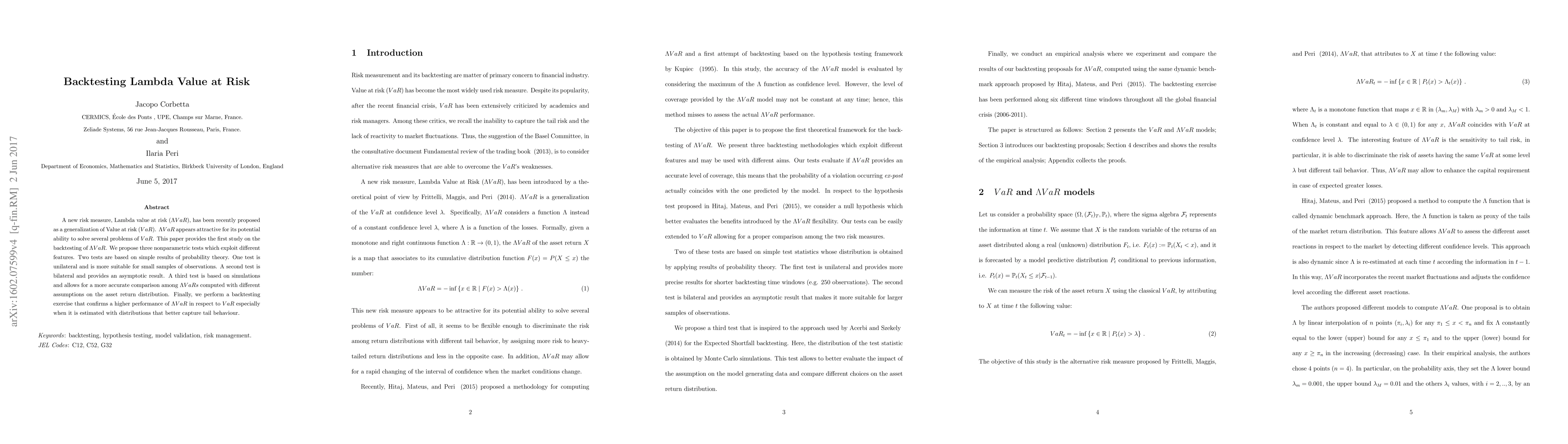 This paper introduces a new risk measure, Lambda VaR, as a generalization of VaR, and proposes three nonparametric backtesting methodologies to assess its accuracy. The tests evaluate coverage level correctness and the accuracy dependent on the P&L distribution, with one providing an asymptotic result. The backtesting results are compared with previous work by Hitaj and Peri (2015).