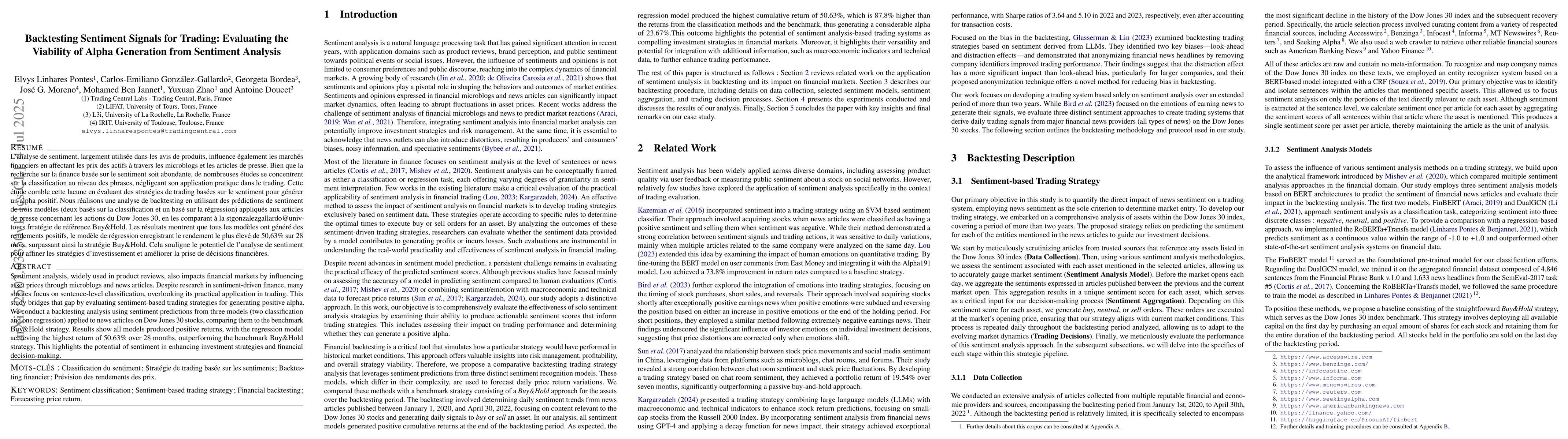 This study evaluates sentiment-based trading strategies by backtesting three models (two classification and one regression) on news articles related to Dow Jones 30 stocks, comparing their performance to a Buy&Hold benchmark.