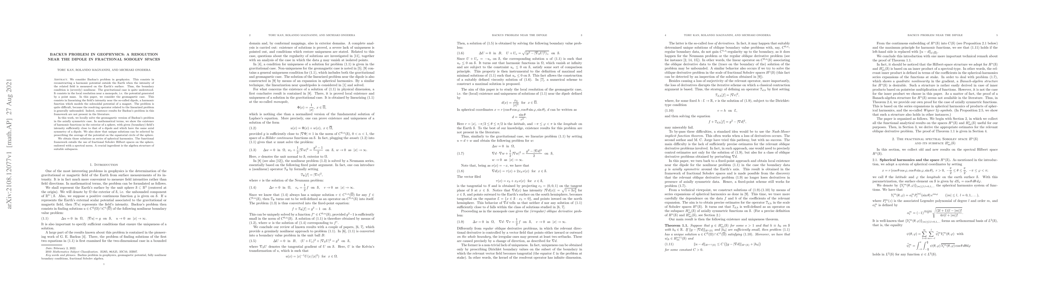 We consider Backus's problem in geophysics. This consists in reconstructing a harmonic potential outside the Earth when the intensity of the related field is measured on the Earth's surface. Thus, the boundary condition is (severely) nonlinear. The gravitational case is quite understood. It consists in the local resolution near a monopole, i.e. the potential generated by a point mass. In this paper, we consider the geomagnetic case. This consists in linearizing the field's intensity near the so-called dipole, a harmonic function which models the solenoidal potential of a magnet. The problem is quite difficult, because the resolving operator related to the linearized problem is generally unbounded. Indeed, existence results for Backus's problem in this framework are not present in the literature. In this work, we locally solve the geomagnetic version of Backus's problem in the axially symmetric case. In mathematical terms, we show the existence of harmonic functions in the exterior of a sphere, with given (boundary) field's intensity sufficiently close to that of a dipole and which have the same axial symmetry of a dipole. We also show that unique solutions can be selected by prescribing the average of the potential on the equatorial circle of the sphere. We obtain those solutions as series of spherical harmonics. The functional framework entails the use of fractional Sobolev Hilbert spaces on the sphere, endowed with a spectral norm. A crucial ingredient is the algebra structure of suitable subspaces.