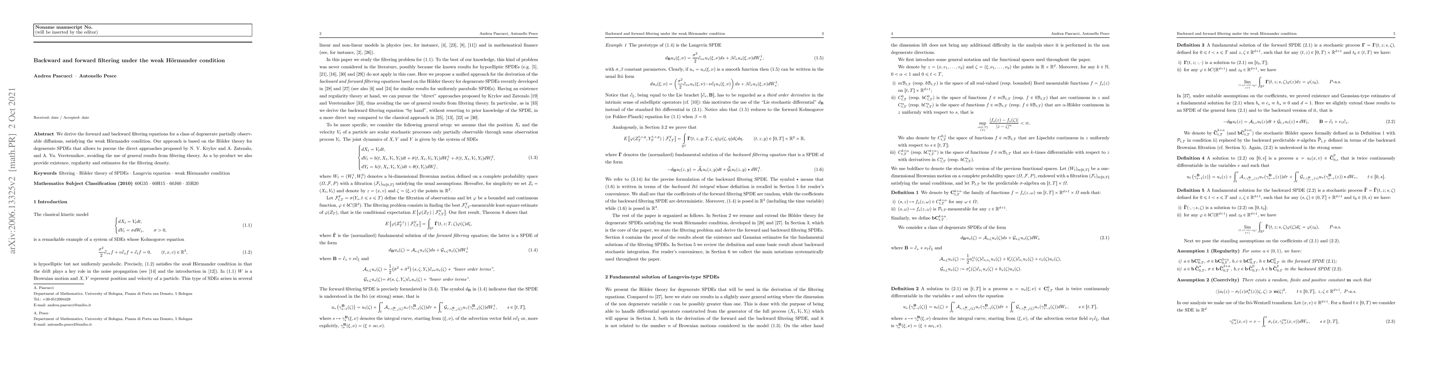 This paper derives forward and backward filtering equations for degenerate partially observable diffusions under the weak Hörmander condition, utilizing H\"older theory for SPDEs and avoiding general filtering theory results. It also establishes existence, regularity, and estimates for the filtering density.