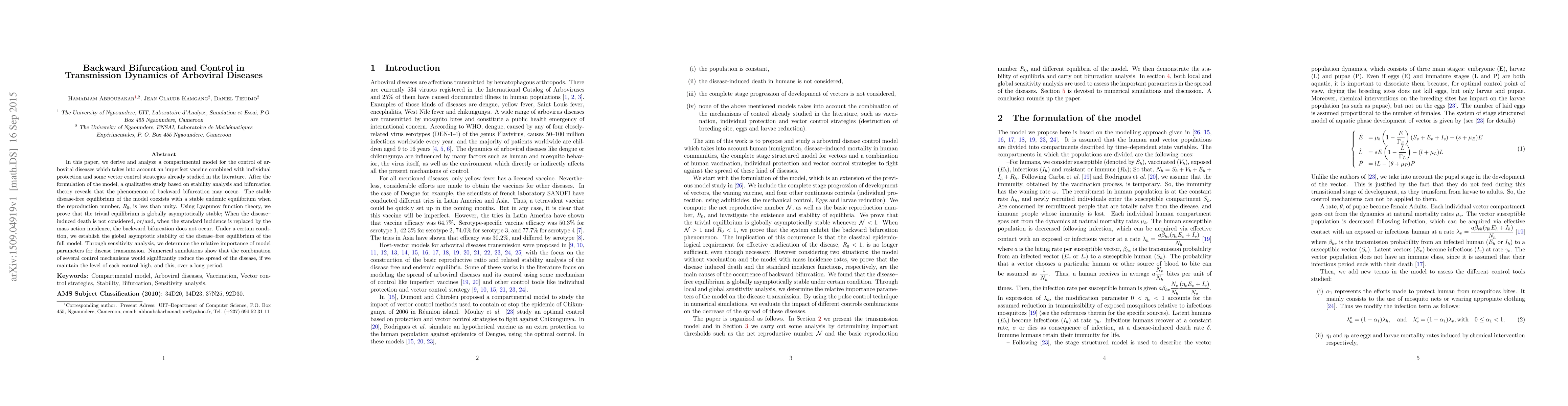 This paper develops a compartmental model for controlling arbovirus diseases, incorporating imperfect vaccines and vector control. It identifies backward bifurcation, where a disease-free equilibrium coexists with an endemic one when the reproduction number is less than one, and proves global stability of the disease-free state under certain conditions. Numerical simulations suggest that sustained high-level control measures can significantly reduce disease spread.