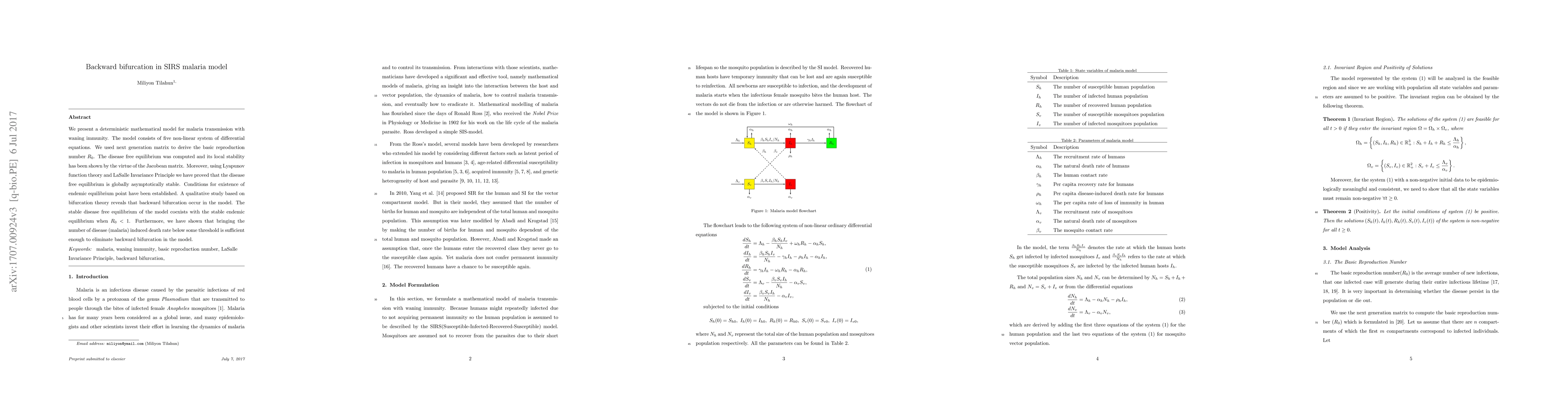 We present a deterministic mathematical model for malaria transmission with waning immunity. The model consists of five non-linear system of differential equations. We used next generation matrix to derive the basic reproduction number $R_0$. The disease free equilibrium was computed and its local stability has been shown by the virtue of the Jacobean matrix. Moreover, using Lyapunov function theory and LaSalle Invariance Principle we have proved that the disease free equilibrium is globally asymptotically stable. Conditions for existence of endemic equilibrium point have been established. A qualitative study based on bifurcation theory reveals that backward bifurcation occur in the model. The stable disease free equilibrium of the model coexists with the stable endemic equilibrium when $R_0<1$. Furthermore, we have shown that bringing the number of disease (malaria) induced death rate below some threshold is sufficient enough to eliminate backward bifurcation in the model.