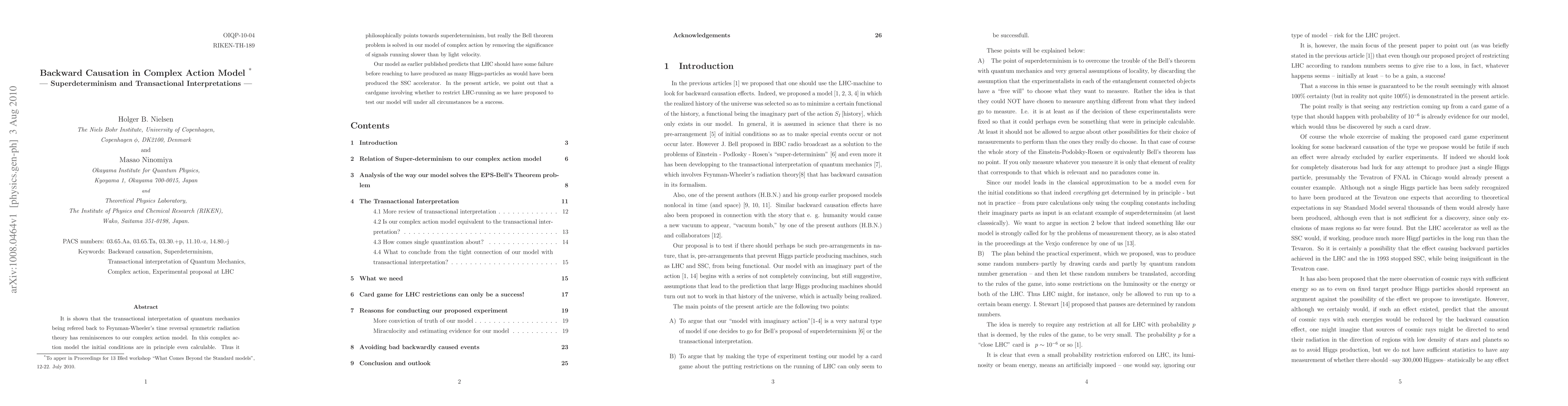 It is shown that the transactional interpretation of quantum mechanics being referred back to Feynman-Wheeler's time reversal symmetric radiation theory has reminiscences to our complex action model. In this complex action model the initial conditions are in principle even calculable. Thus it philosophically points towards superdeterminism, but really the Bell theorem problem is solved in our model of complex action by removing the significance of signals running slower than by light velocity. Our model as earlier published predicts that LHC should have some failure before reaching to have produced as many Higgs-particles as would have been produced the SSC accelerator. In the present article, we point out that a cardgame involving whether to restrict LHC-running as we have proposed to test our model will under all circumstances be a success.