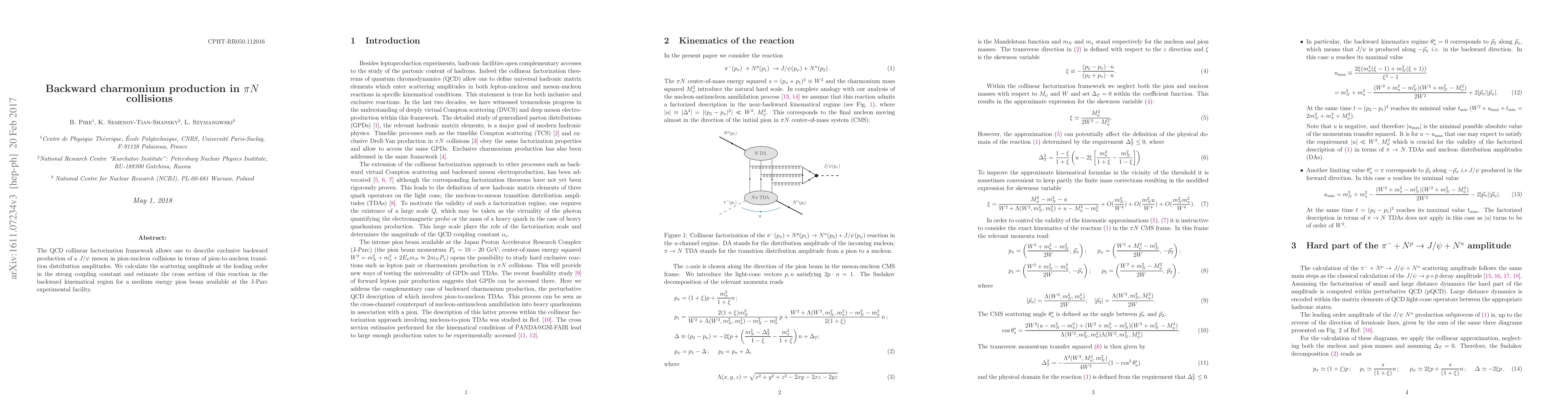 The QCD collinear factorization framework allows to describe exclusive backward production of a $J/\psi$ meson in pion-nucleon collisions in terms of pion-to-nucleon transition distribution amplitudes. We calculate the scattering amplitude at the leading order in the strong coupling constant and estimate the cross section of this reaction in the backward kinematical region for a medium energy pion beam available at the J-Parc experimental facility.