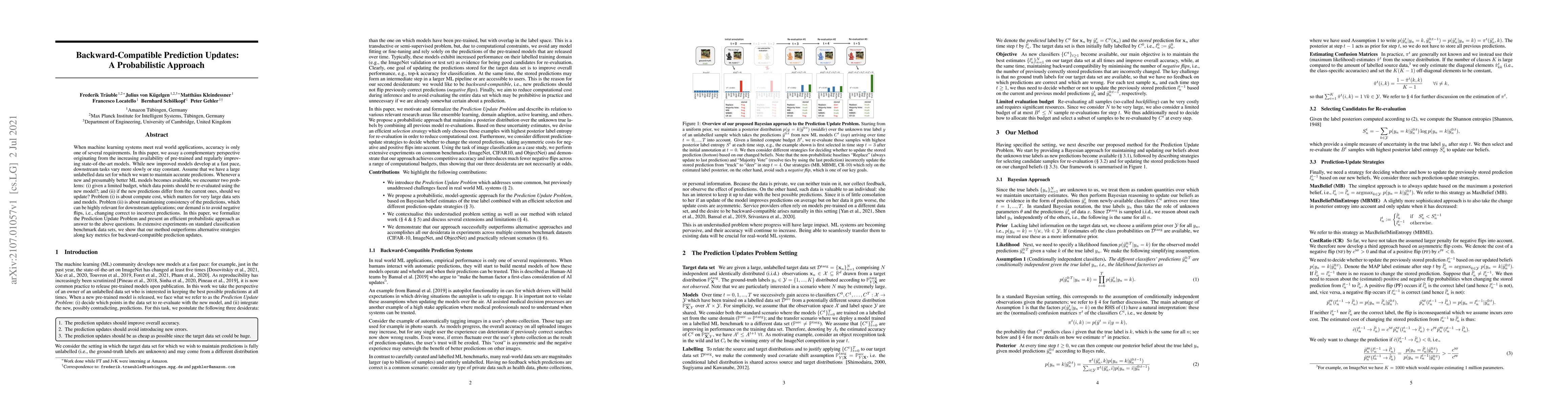 When machine learning systems meet real world applications, accuracy is only one of several requirements. In this paper, we assay a complementary perspective originating from the increasing availability of pre-trained and regularly improving state-of-the-art models. While new improved models develop at a fast pace, downstream tasks vary more slowly or stay constant. Assume that we have a large unlabelled data set for which we want to maintain accurate predictions. Whenever a new and presumably better ML models becomes available, we encounter two problems: (i) given a limited budget, which data points should be re-evaluated using the new model?; and (ii) if the new predictions differ from the current ones, should we update? Problem (i) is about compute cost, which matters for very large data sets and models. Problem (ii) is about maintaining consistency of the predictions, which can be highly relevant for downstream applications; our demand is to avoid negative flips, i.e., changing correct to incorrect predictions. In this paper, we formalize the Prediction Update Problem and present an efficient probabilistic approach as answer to the above questions. In extensive experiments on standard classification benchmark data sets, we show that our method outperforms alternative strategies along key metrics for backward-compatible prediction updates.