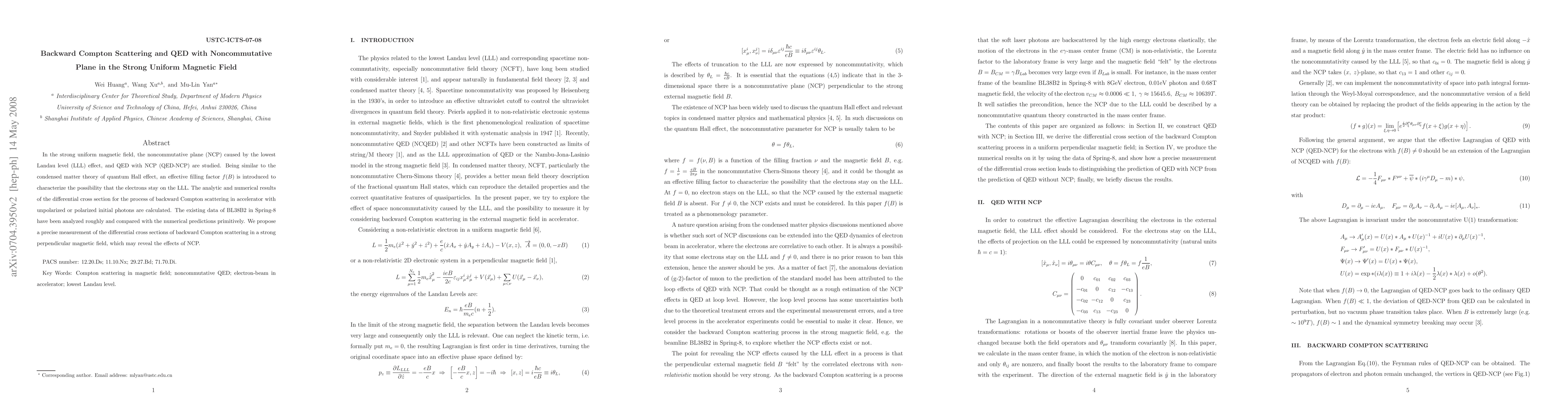 In the strong uniform magnetic field, the noncommutative plane (NCP) caused by the lowest Landau level (LLL) effect, and QED with NCP (QED-NCP) are studied. Being similar to the condensed matter theory of quantum Hall effect, an effective filling factor $f(B)$ is introduced to character the possibility that the electrons stay on the LLL. The analytic and numerical results of the differential cross section for the process of backward Compton scattering in the accelerator with unpolarized or polarized initial photons are calculated. The existing data of BL38B2 in Spring-8 have been analyzed roughly and compared with the numerical predictions primitively. We propose a precise measurement of the differential cross sections of backward Compton scattering in a strong perpendicular magnetic field, which may lead to reveal the effects of QED-NCP.