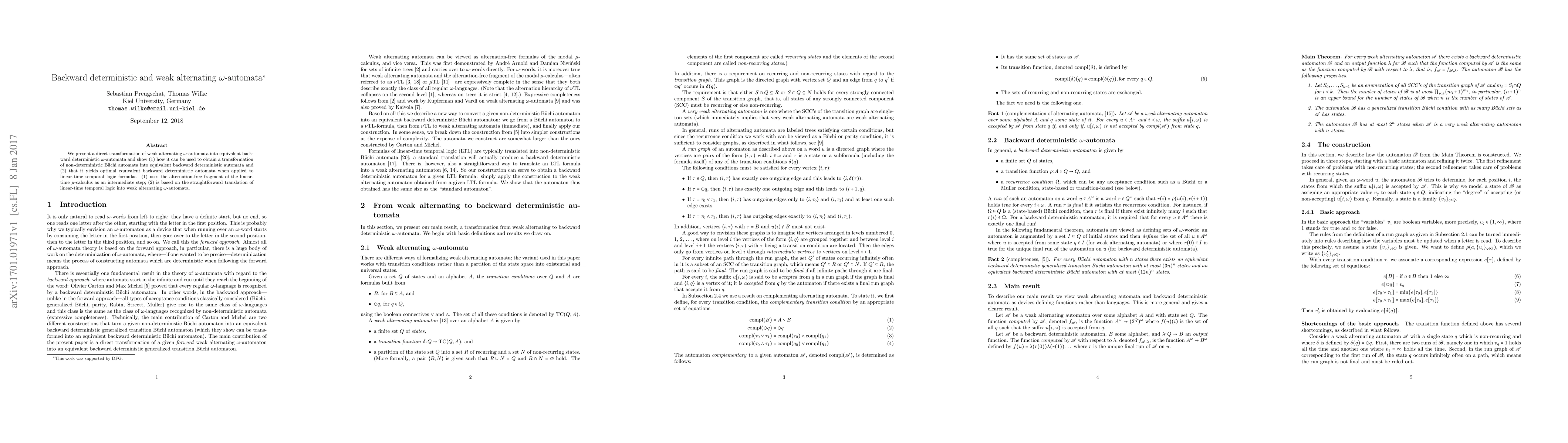 We present a direct transformation of weak alternating $\omega$-automata into equivalent backward deterministic $\omega$-automata and show (1) how it can be used to obtain a transformation of non-deterministic B\"uchi automata into equivalent backward deterministic automata and (2) that it yields optimal equivalent backward deterministic automata when applied to linear-time temporal logic formulas. (1) uses the alternation-free fragment of the linear-time $\mu$-calculus as an intermediate step; (2) is based on the straightforward translation of linear-time temporal logic into weak alternating $\omega$-automata.