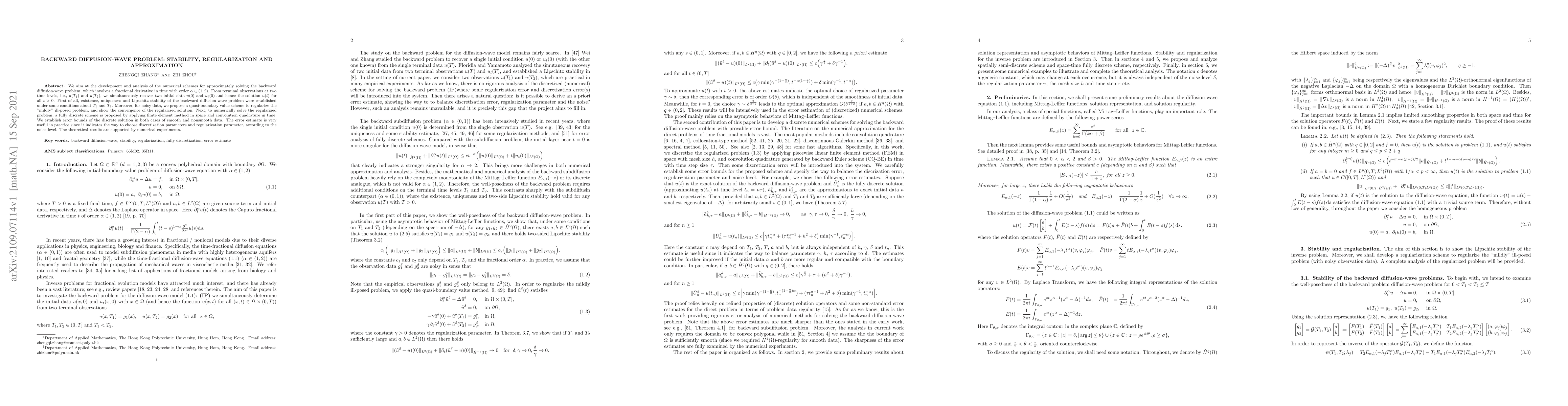 This paper develops numerical schemes to solve a fractional derivative problem in diffusion-wave equations, establishing stability, regularization, and error bounds for both smooth and nonsmooth data.