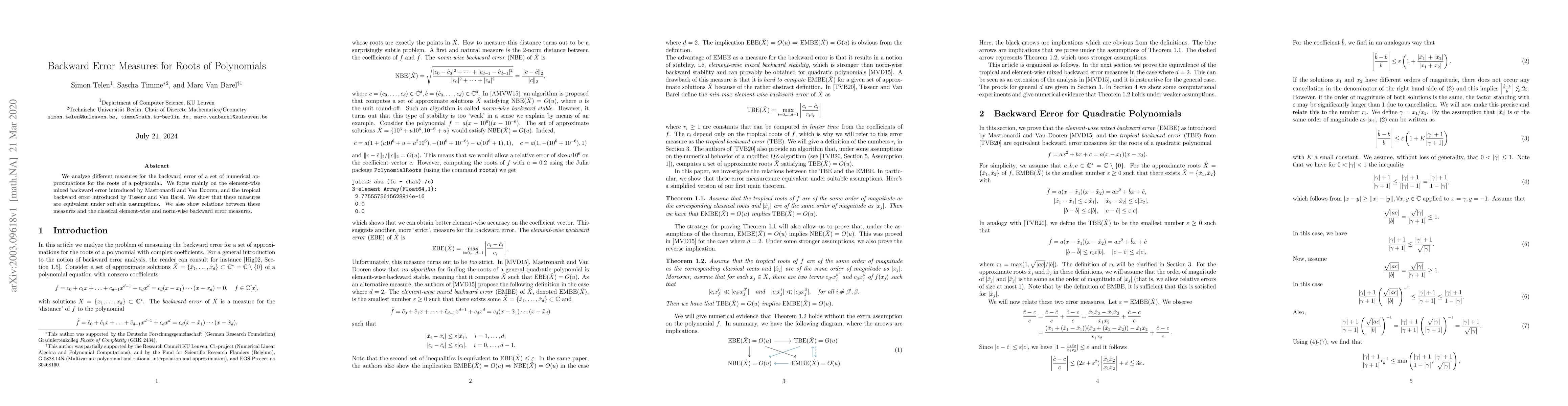 Researchers analyze measures for the backward error of polynomial root approximations, finding that certain methods are equivalent under suitable assumptions.