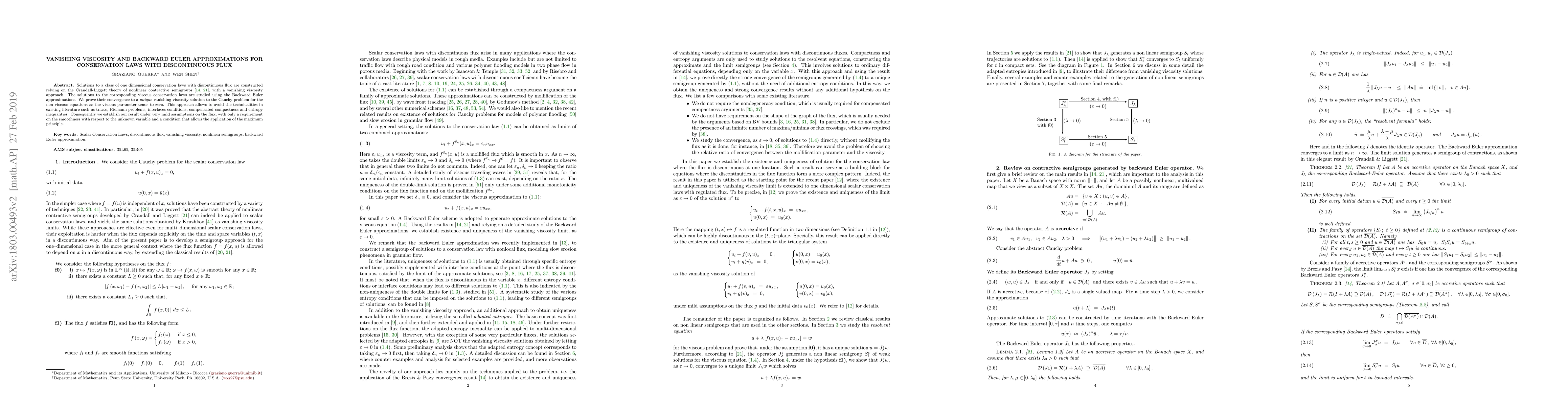 This paper investigates backward Euler approximations for conservation laws featuring discontinuous flux, leveraging Crandall-Liggett theory to establish their existence and convergence to a unique entropy-admissible solution, with proofs derived from viscous conservation laws analysis.