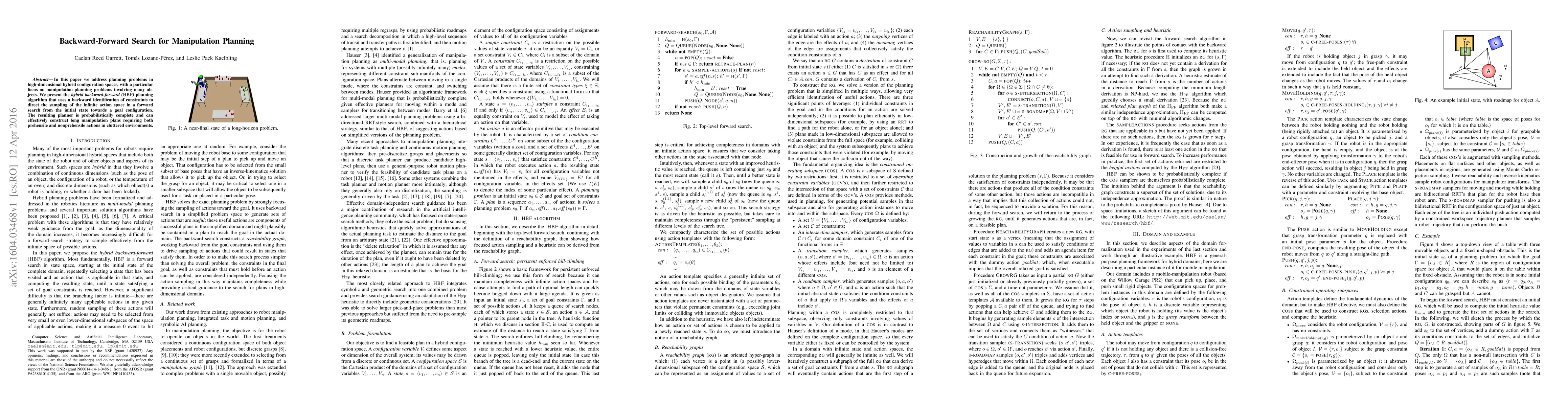 The paper presents the hybrid backward-forward (HBF) planning algorithm for high-dimensional hybrid configuration spaces, focusing on manipulation planning problems involving multiple objects. It uses backward identification of constraints to guide the sampling of an infinite action space during forward search from the initial state towards a goal configuration.