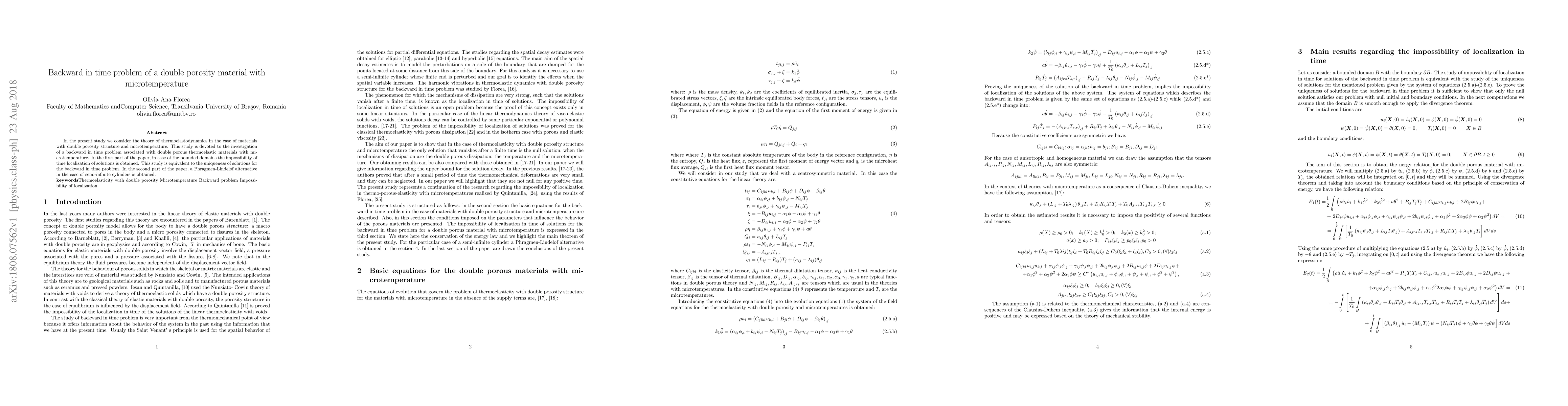 Researchers investigated a backward in time problem for double porosity materials with microtemperature, finding that solutions cannot be localized to specific times in bounded domains, but an alternative exists for semi-infinite cylinders.