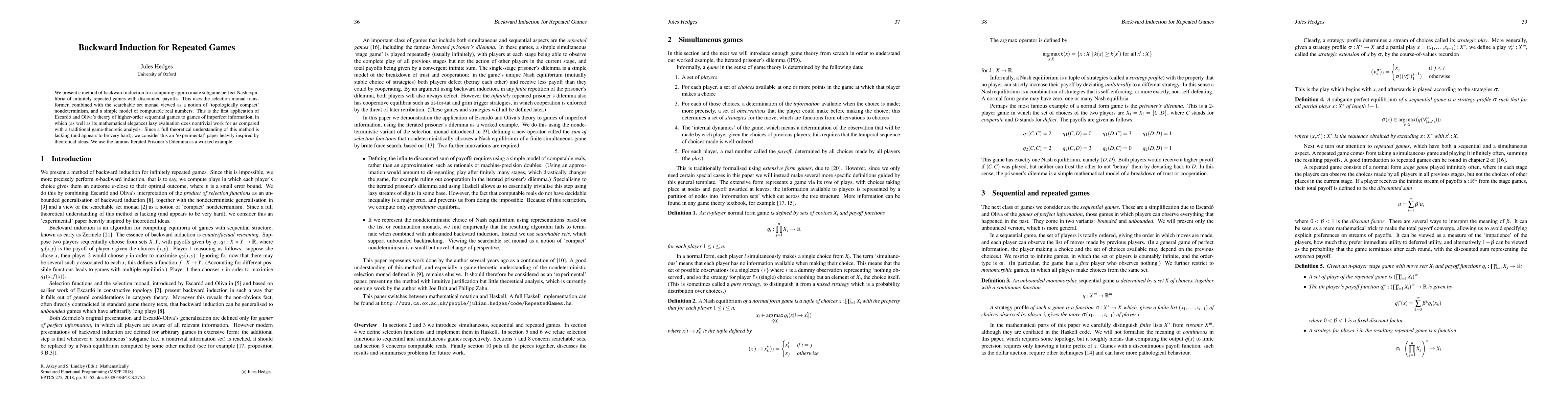 This paper introduces a method for approximating subgame perfect Nash equilibria in infinitely repeated games with discounted payoffs using backward induction. It employs the selection monad transformer, searchable set monad, and computable real numbers, marking the first application of Escardó and Oliva's higher-order sequential game theory to games of imperfect information. The Iterated Prisoner's Dilemma serves as an illustrative example, presenting it as an experimental work rooted in theoretical concepts.