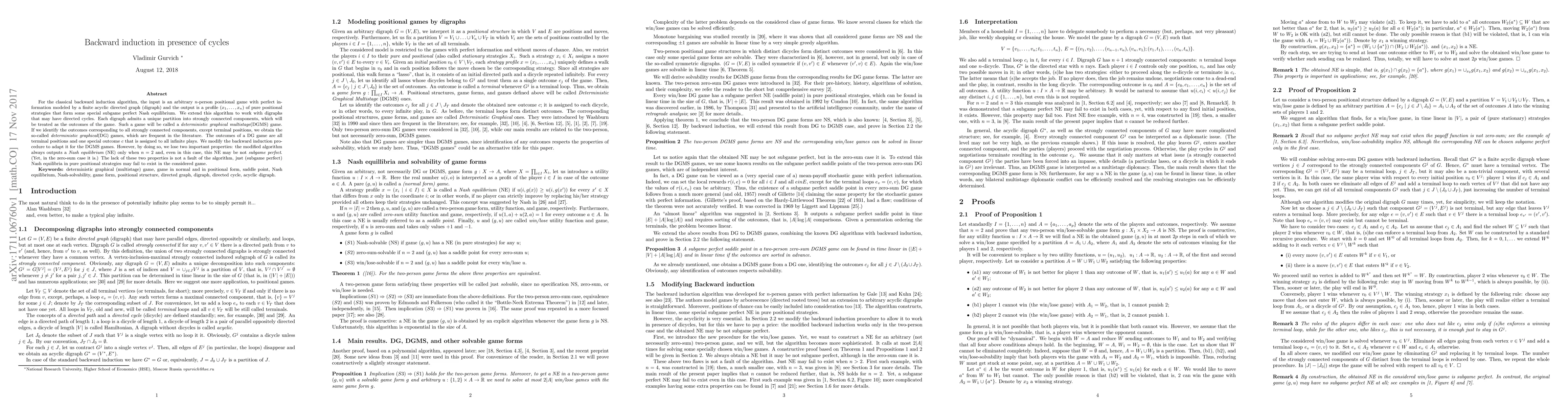 This paper extends the classical backward induction algorithm to handle $n$-person positional games represented by directed graphs that may contain cycles. It introduces deterministic graphical multistage (DGMS) games, which partition into strongly connected components, and modifies the algorithm to find Nash equilibria, though it notes that the modified algorithm only guarantees Nash equilibria for $n=2$ and may not be subgame perfect.