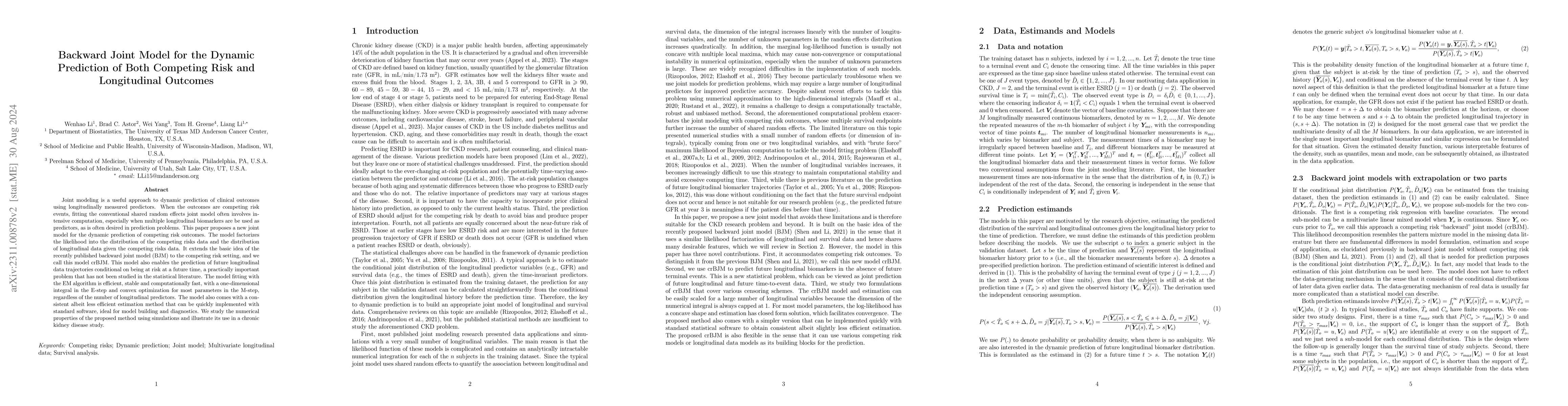 This paper proposes a new backward joint model for dynamic prediction of clinical outcomes using multivariate longitudinal data and competing risk events, specifically for end-stage renal disease in chronic kidney disease patients. The model efficiently estimates parameters using an EM algorithm with a one-dimensional integral and convex optimization, enabling practical predictions of future longitudinal data trajectories.