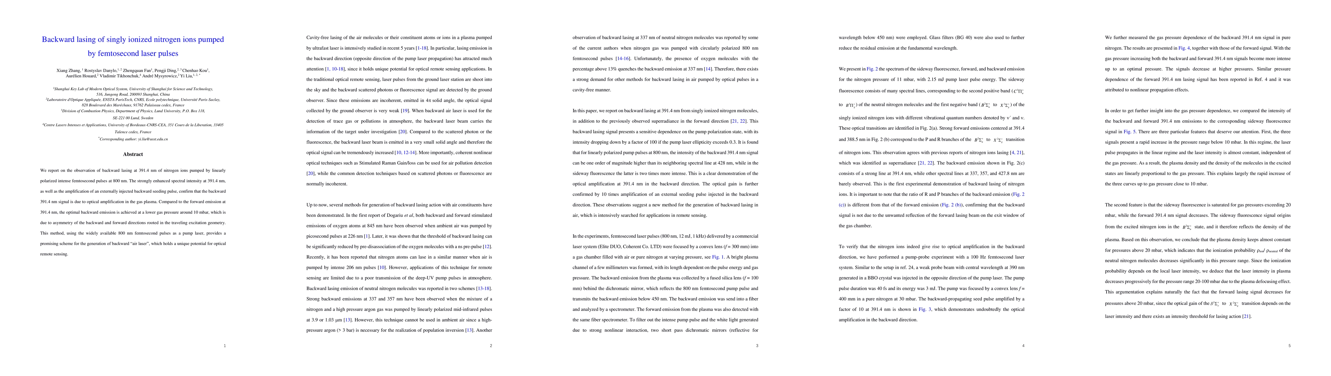 This paper reports on the observation of backward lasing at 391.4 nm in singly ionized nitrogen ions pumped by intense femtosecond laser pulses at 800 nm, demonstrating optical amplification in gas plasma. The optimal backward emission occurs at lower gas pressures, suggesting potential for remote sensing applications.