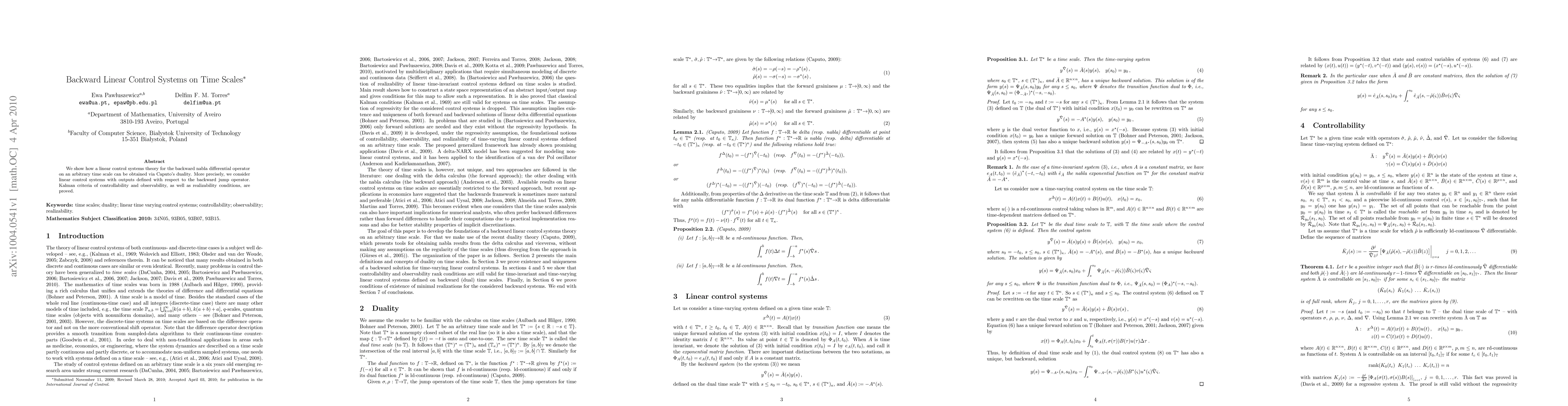 This paper develops a linear control systems theory for backward nabla differential operators on time scales using Caputo's duality. It establishes Kalman criteria for controllability, observability, and realizability for these systems.