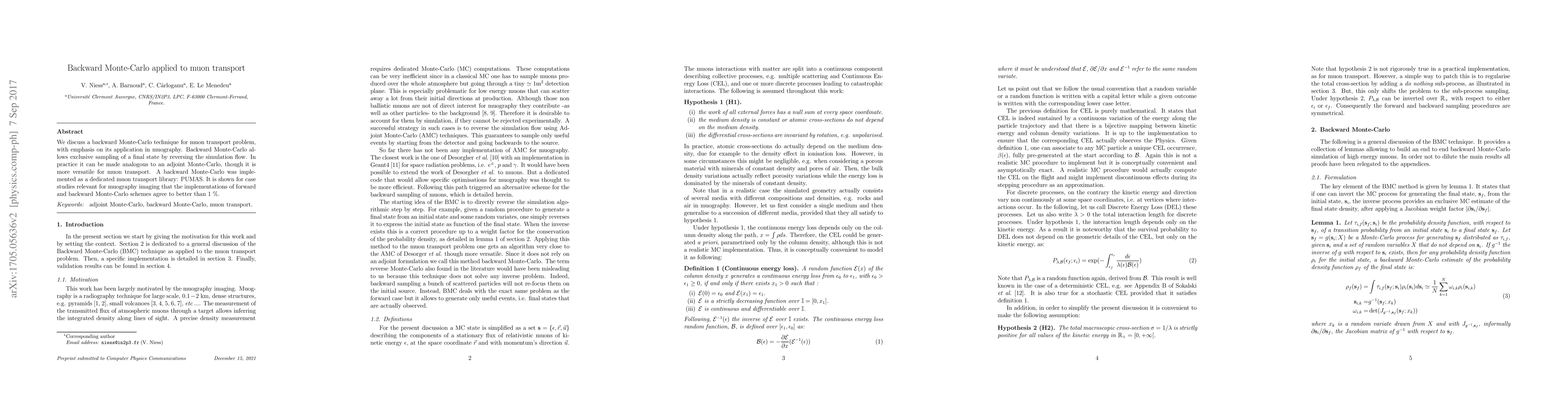 The paper presents a backward Monte-Carlo technique for muon transport simulations, implemented in the PUMAS library, which offers a versatile alternative to traditional forward methods. The method demonstrates high accuracy in muography applications, with forward and backward simulations showing agreement better than 1%.