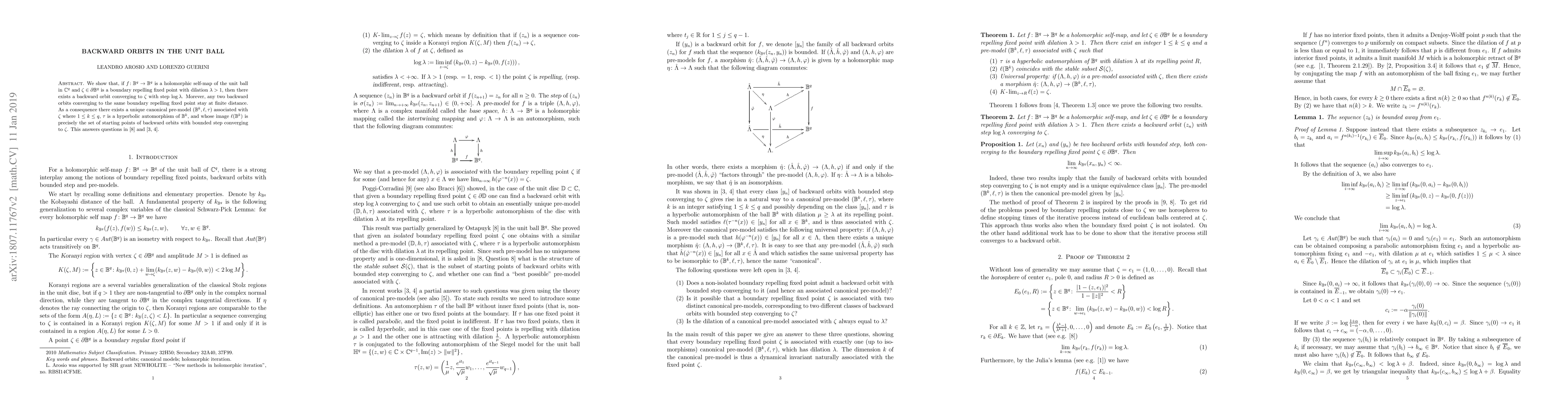 A holomorphic self-map of the unit ball in C^q has a unique backward orbit converging to a boundary repelling fixed point with step log(lambda), where lambda > 1.