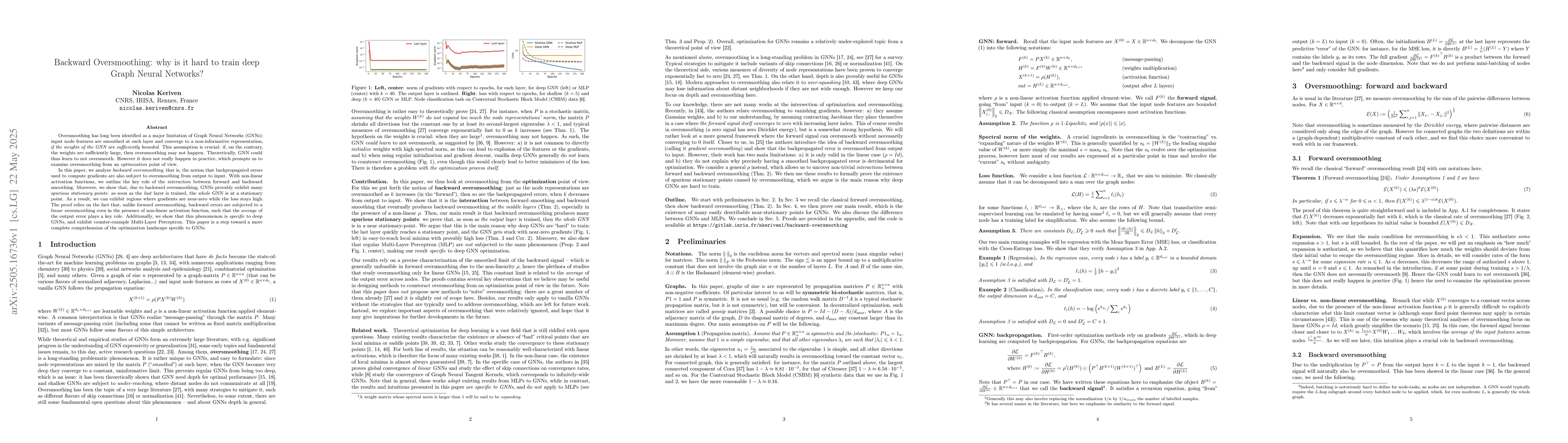 The paper outlines the role of backward oversmoothing in GNN optimization, proving that spurious stationary points emerge due to linear oversmoothing of backpropagated errors.