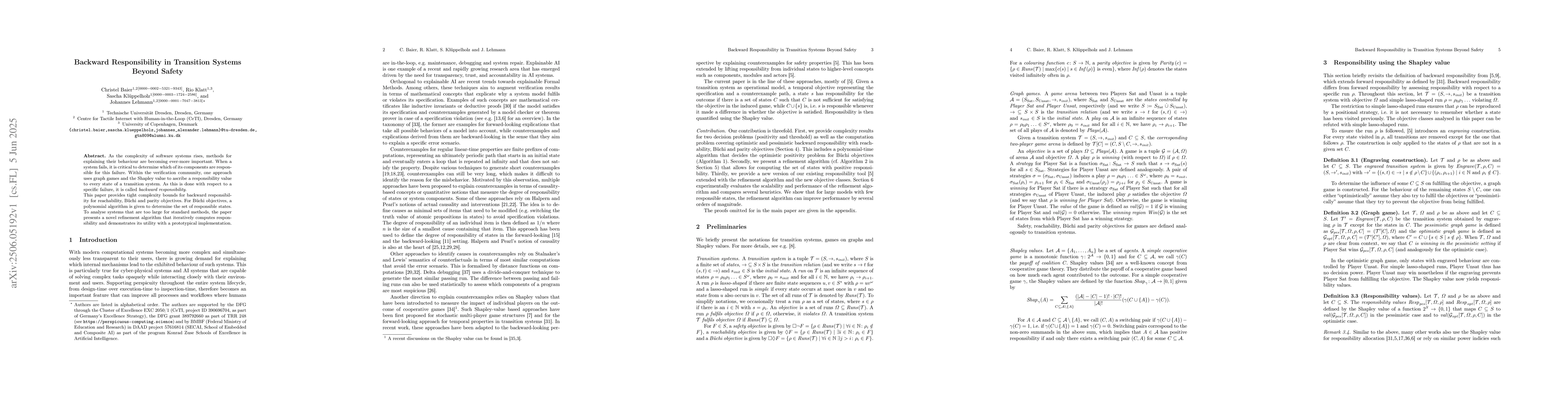 As the complexity of software systems rises, methods for explaining their behaviour are becoming ever-more important. When a system fails, it is critical to determine which of its components are responsible for this failure. Within the verification community, one approach uses graph games and the Shapley value to ascribe a responsibility value to every state of a transition system. As this is done with respect to a specific failure, it is called backward responsibility. This paper provides tight complexity bounds for backward responsibility for reachability, B\"uchi and parity objectives. For B\"uchi objectives, a polynomial algorithm is given to determine the set of responsible states. To analyse systems that are too large for standard methods, the paper presents a novel refinement algorithm that iteratively computes responsibility and demonstrates its utility with a prototypical implementation.