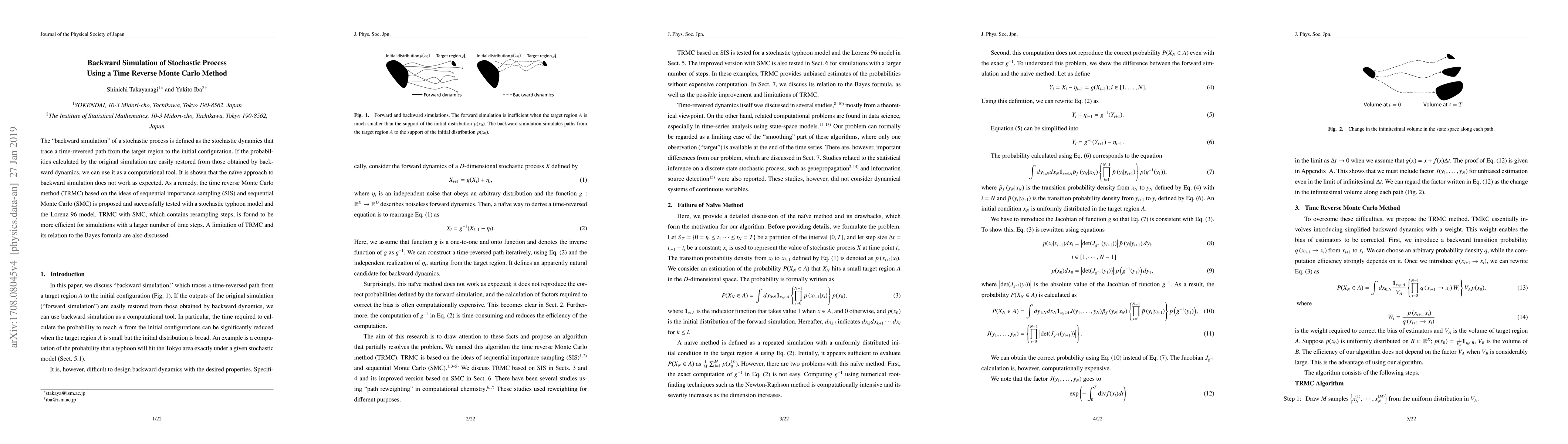 This paper proposes the Time Reverse Monte Carlo (TRMC) method for backward simulation of stochastic processes, addressing the inefficiency of naive approaches. TRMC, based on Sequential Importance Sampling and Sequential Monte Carlo, is tested on a typhoon model and Lorenz 96 model, showing improved efficiency for larger simulations, though its limitations and relation to the Bayes formula are also discussed.