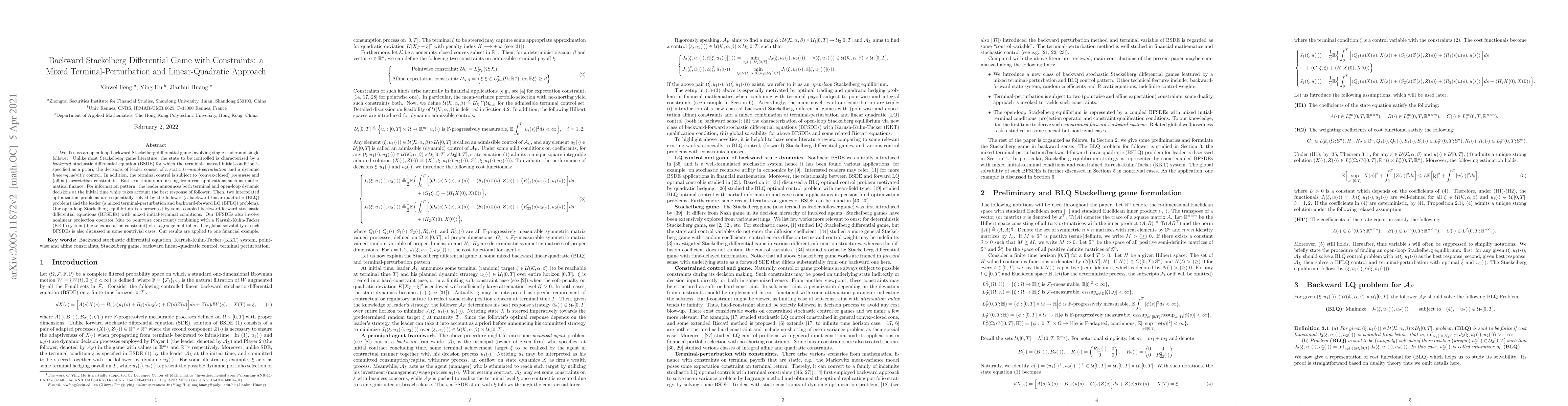 We discuss an open-loop backward Stackelberg differential game involving single leader and single follower. Unlike most Stackelberg game literature, the state to be controlled is characterized by a backward stochastic differential equation (BSDE) for which the terminal- instead initial-condition is specified as a priori; the decisions of leader consist of a static terminal-perturbation and a dynamic linear-quadratic control. In addition, the terminal control is subject to (convex-closed) pointwise and (affine) expectation constraints. Both constraints are arising from real applications such as mathematical finance. For information pattern: the leader announces both terminal and open-loop dynamic decisions at the initial time while takes account the best response of follower. Then, two interrelated optimization problems are sequentially solved by the follower (a backward linear-quadratic (BLQ) problem) and the leader (a mixed terminal-perturbation and backward-forward LQ (BFLQ) problem). Our open-loop Stackelberg equilibrium is represented by some coupled backward-forward stochastic differential equations (BFSDEs) with mixed initial-terminal conditions. Our BFSDEs also involve nonlinear projection operator (due to pointwise constraint) combining with a Karush-Kuhn-Tucker (KKT) system (due to expectation constraint) via Lagrange multiplier. The global solvability of such BFSDEs is also discussed in some nontrivial cases. Our results are applied to one financial example.