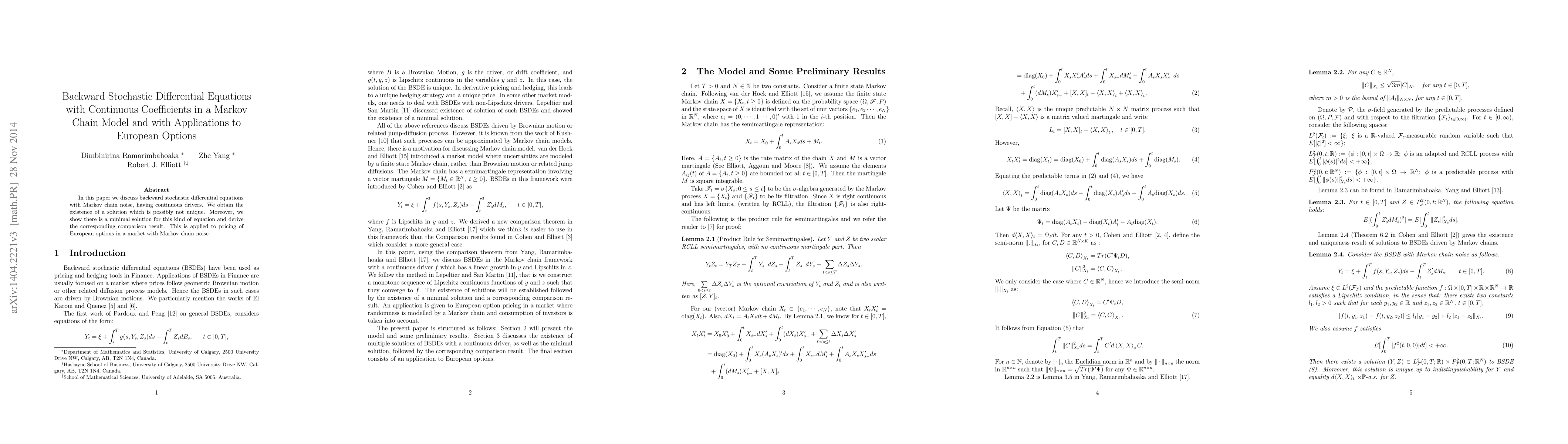 This paper investigates backward stochastic differential equations driven by Markov chain noise with continuous coefficients, proving the existence of a minimal solution and deriving a comparison result. The findings are applied to the pricing of European options in a market influenced by Markov chain noise.