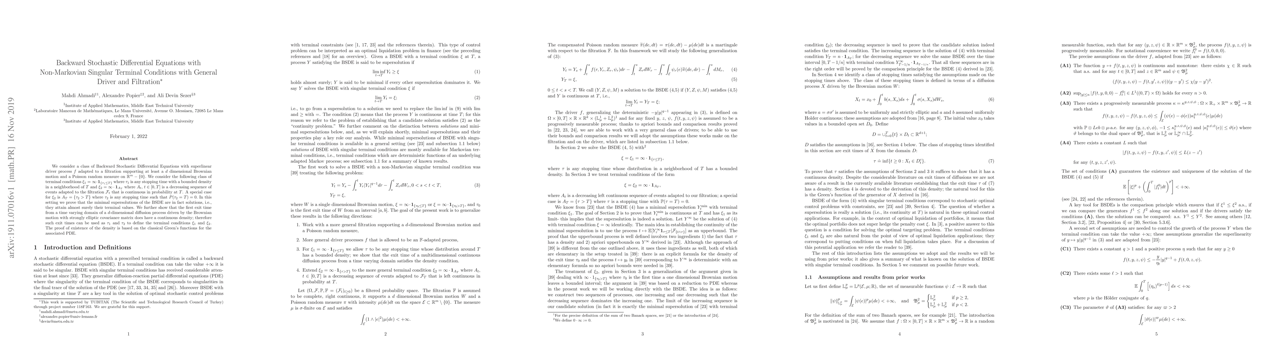 We consider a class of Backward Stochastic Differential Equations with superlinear driver process $f$ adapted to a filtration supporting at least a $d$ dimensional Brownian motion and a Poisson random measure on ${\mathbb R}^m- \{0\}.$ We consider the following class of terminal conditions $\xi_1 = \infty \cdot 1_{\{\tau_1 \le T\}}$ where $\tau_1$ is any stopping time with a bounded density in a neighborhood of $T$ and $\xi_2 = \infty \cdot 1_{A_T}$ where $A_t$, $t \in [0,T]$ is a decreasing sequence of events adapted to the filtration ${\mathcal F}_t$ that is continuous in probability at $T$. A special case for $\xi_2$ is $A_T = \{\tau_2 > T\}$ where $\tau_2$ is any stopping time such that $P(\tau_2 =T) =0.$ In this setting we prove that the minimal supersolutions of the BSDE are in fact solutions, i.e., they attain almost surely their terminal values. We further show that the first exit time from a time varying domain of a $d$-dimensional diffusion process driven by the Brownian motion with strongly elliptic covariance matrix does have a continuous density; therefore such exit times can be used as $\tau_1$ and $\tau_2$ to define the terminal conditions $\xi_1$ and $\xi_2.$ The proof of existence of the density is based on the classical Green's functions for the associated PDE.