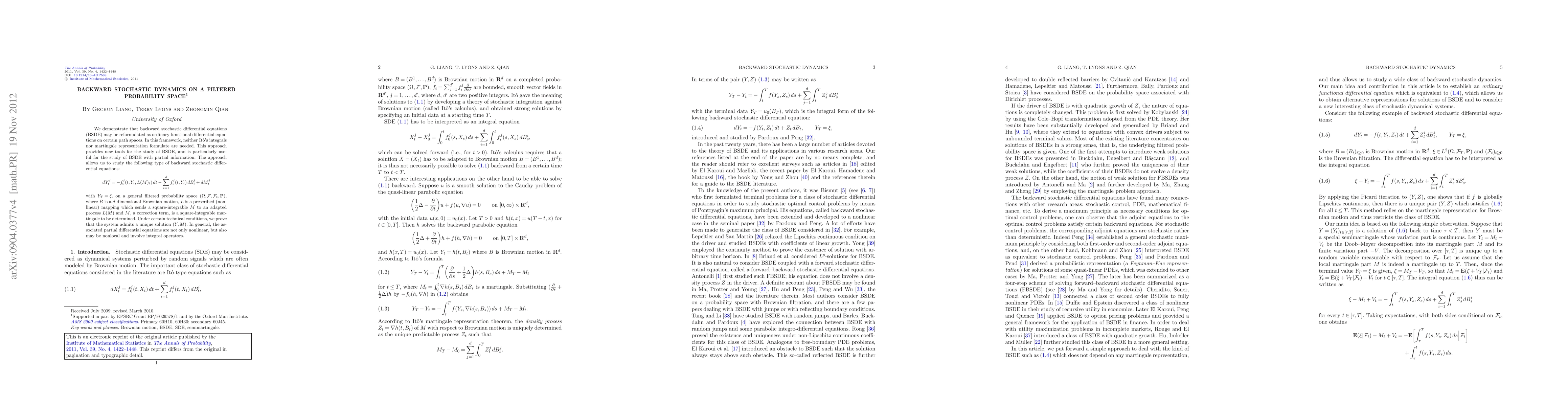 We demonstrate that backward stochastic differential equations (BSDE) may be reformulated as ordinary functional differential equations on certain path spaces. In this framework, neither It\^{o}'s integrals nor martingale representation formulate are needed. This approach provides new tools for the study of BSDE, and is particularly useful for the study of BSDE with partial information. The approach allows us to study the following type of backward stochastic differential equations: \[dY_t^j=-f_0^j(t,Y_t,L(M)_t) dt-\sum_{i=1}^df_i^j(t,Y_t), dB_t^i+dM_t^j\] with $Y_T=\xi$, on a general filtered probability space $(\Omega,\mathcal{F},\mathcal{F}_t,P)$, where $B$ is a $d$-dimensional Brownian motion, $L$ is a prescribed (nonlinear) mapping which sends a square-integrable $M$ to an adapted process $L(M)$ and $M$, a correction term, is a square-integrable martingale to be determined. Under certain technical conditions, we prove that the system admits a unique solution $(Y,M)$. In general, the associated partial differential equations are not only nonlinear, but also may be nonlocal and involve integral operators.