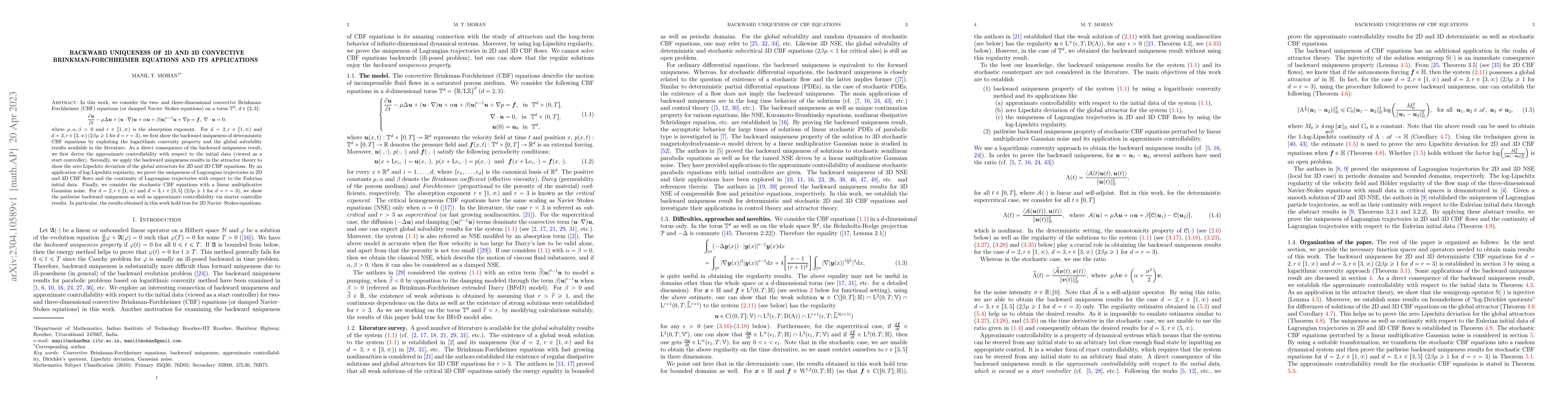 In this work, we consider the two- and three-dimensional convective Brinkman-Forchheimer (CBF) equations (or damped Navier--Stokes equations) on a torus $\mathbb{T}^d,$ $d\in\{2,3\}$: $$ \frac{\partial \boldsymbol{u}}{\partial t}-\mu \Delta\boldsymbol{u}+(\boldsymbol{u}\cdot\nabla)\boldsymbol{u}+\alpha\boldsymbol{u}+\beta|\boldsymbol{u}|^{r-1}\boldsymbol{u}+\nabla p=\boldsymbol{f}, \ \nabla\cdot\boldsymbol{u}=0,$$ where $\mu,\alpha,\beta>0$ and $r\in[1,\infty)$ is the absorption exponent. For $d=2,r\in[1,\infty)$ and $d=3,r\in[3,\infty)$ ($2\beta\mu\geq 1$ for $d=r=3$), we first show the backward uniqueness of deterministic CBF equations by exploiting the logarithmic convexity property and the global solvability results available in the literature. As a direct consequence of the backward uniqueness result, we first derive the approximate controllability with respect to the initial data (viewed as a start controller). Secondly, we apply the backward uniqueness results in the attractor theory to show the zero Lipschitz deviation of the global attractors for 2D and 3D CBF equations. By an application of log-Lipschitz regularity, we prove the uniqueness of Lagrangian trajectories in 2D and 3D CBF flows and the continuity of Lagrangian trajectories with respect to the Eulerian initial data. Finally, we consider the stochastic CBF equations with a linear multiplicative Gaussian noise. For $d=2,r\in[1,\infty)$ and $d=3,r\in[3,5]$ ($2\beta\mu\geq 1$ for $d=r=3$), we show the pathwise backward uniqueness as well as approximate controllability via starter controller results. In particular, the results obtained in this work hold true for 2D Navier--Stokes equations.
