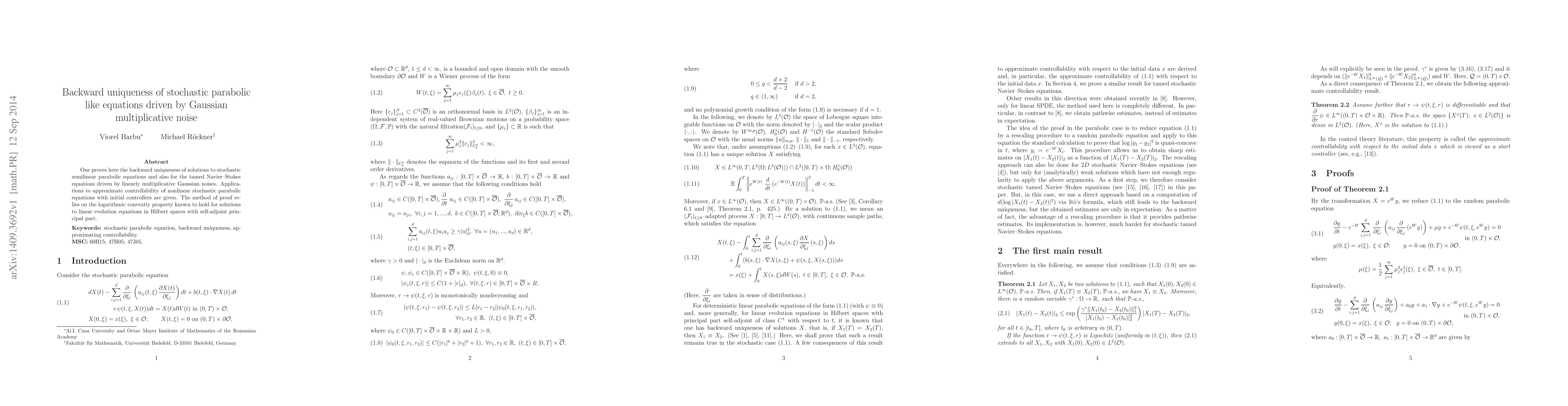 This paper proves backward uniqueness for solutions of stochastic semilinear parabolic equations and tamed Navier-Stokes equations driven by Gaussian multiplicative noise, utilizing the logarithmic convexity property of linear evolution equations in Hilbert spaces. Applications extend to approximate controllability of nonlinear stochastic parabolic equations.