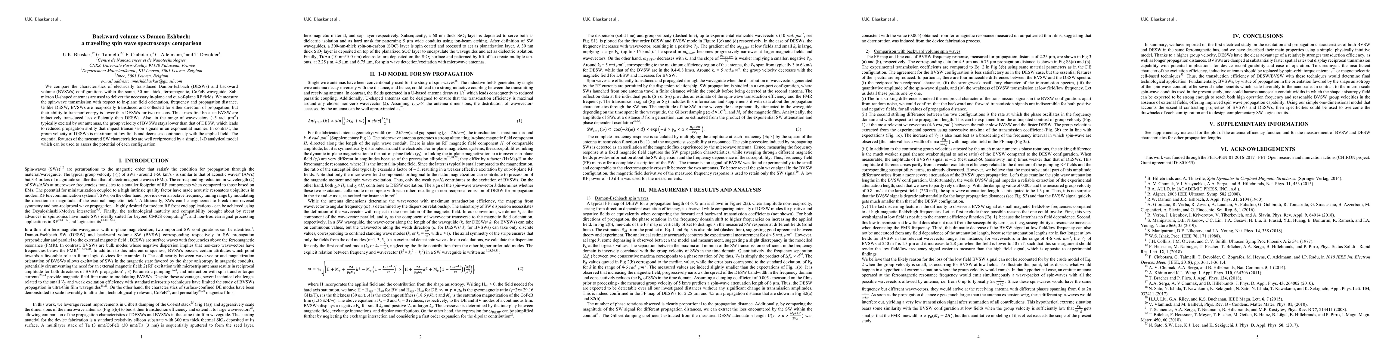 We compare the characteristics of electrically transduced Damon-Eshbach (DESWs) and backward volume (BVSWs) configurations within the same, 30 nm thick, ferromagnetic, CoFeB waveguide. Sub-micron U-shaped antennas are used to deliver the necessary in-plane and out-of-plane RF fields. We measure the spin-wave transmission with respect to in-plane field orientation, frequency and propagation distance. Unlike DESW, BVSWs are reciprocally transduced and collected for either direction of propagation, but their ability to transport energy is lower than DESWs for two reasons. This arises first because BVSW are inductively transduced less efficiently than DESWs. Also, in the range of wavevectors (~5 rad. um-1) typically excited by our antennas, the group velocity of BVSWs stays lower than that of DESW, which leads to reduced propagation ability that impact transmission signals in an exponential manner. In contrast, the group velocity of DESWs is maximum at low fields and decreases continuously with the applied field. The essential features of the measured SW characteristics are well reciprocated by a simple, 1-D analytical model which can be used to assess the potential of each configuration.