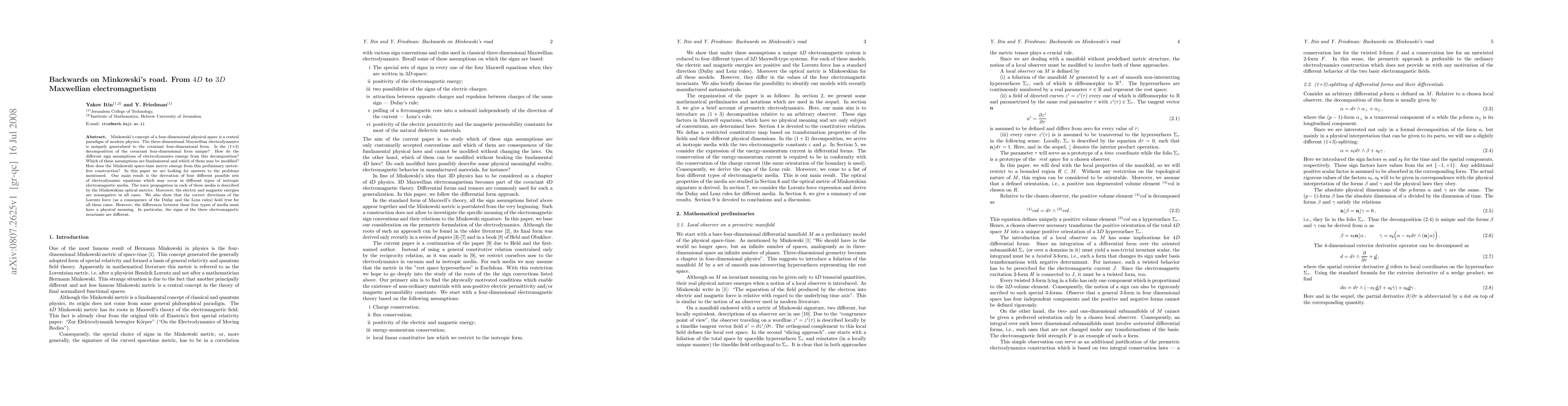 Minkowski's concept of a four-dimensional physical space is a central paradigm of modern physics. The three-dimensional Maxwellian electrodynamics is uniquely generalized to the covariant four-dimensional form. Is the (1+3) decomposition of the covariant four-dimensional form unique? How do the different sign assumptions of electrodynamics emerge from this decomposition? Which of these assumptions are fundamental and which of them may be modified? How does the Minkowski space-time metric emerge from this preliminary metric-free construction? In this paper we are looking for answers to the problems mentioned. Our main result is the derivation of four different possible sets of electrodynamic equations which may occur in different types of isotropic electromagnetic media. The wave propagation in each of these media is described by the Minkowskian optical metrics. Moreover, the electric and magnetic energies are nonnegative in all cases. We also show that the correct directions of the Lorentz force (as a consequence of the Dufay and the Lenz rules) hold true for all these cases. However, the differences between these four types of media must have a physical meaning. In particular, the signs of the three electromagnetic invariants are different.