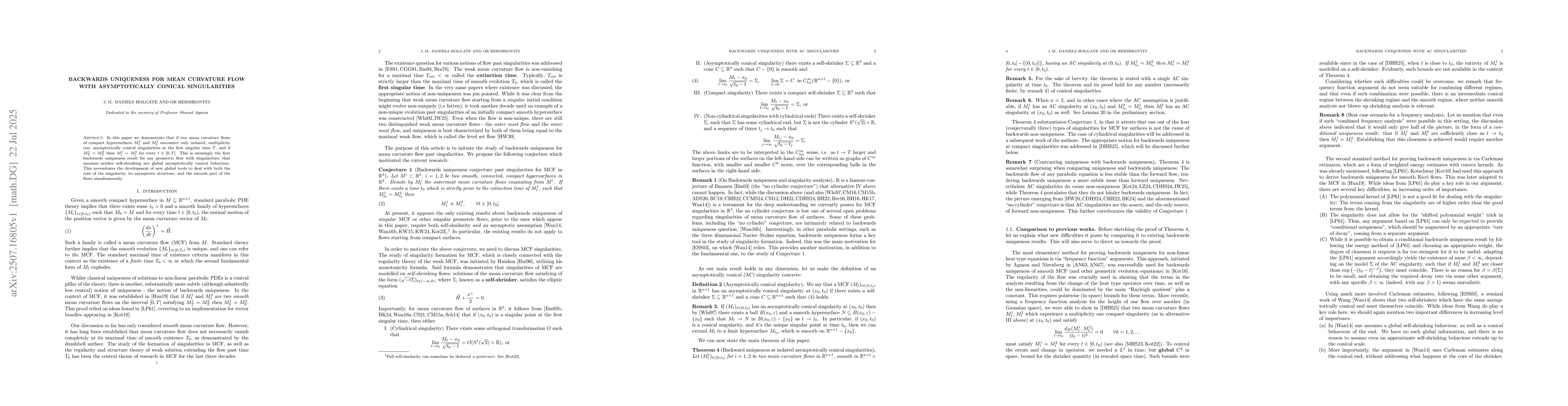 In this paper we demonstrate that if two mean curvature flows of compact hypersurfaces $M^1_t$ and $M^2_t$ encounter only isolated, multiplicity one, asymptotically conical singularities at the first singular time $T$, and if $M^1_T=M^2_T$ then $M^1_t=M^2_t$ for every $t\in [0,T]$. This is seemingly the first backwards uniqueness result for any geometric flow with singularities, that assumes neither {self-shrinking} nor global asymptotically conical {behaviour}. This necessitates the development of new global tools to deal with both the core of the singularity, its asymptotic structure, and the smooth part of the flows simultaneously.