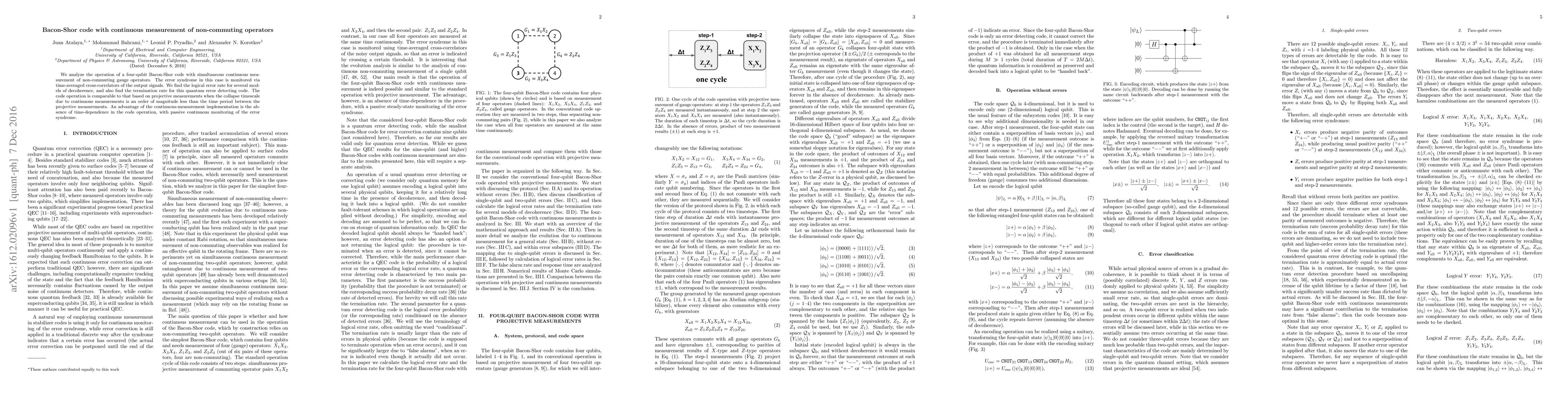 We analyze the operation of a four-qubit Bacon-Shor code with simultaneous continuous measurement of non-commuting gauge operators. The error syndrome in this case is monitored via time-averaged cross-correlators of the output signals. We find the logical error rate for several models of decoherence, and also find the termination rate for this quantum error detecting code. The code operation is comparable to that based on projective measurements when the collapse timescale due to continuous measurements is an order of magnitude less than the time period between the projective measurements. An advantage of the continuous-measurement implementation is the absence of time-dependence in the code operation, with passive continuous monitoring of the error syndrome.