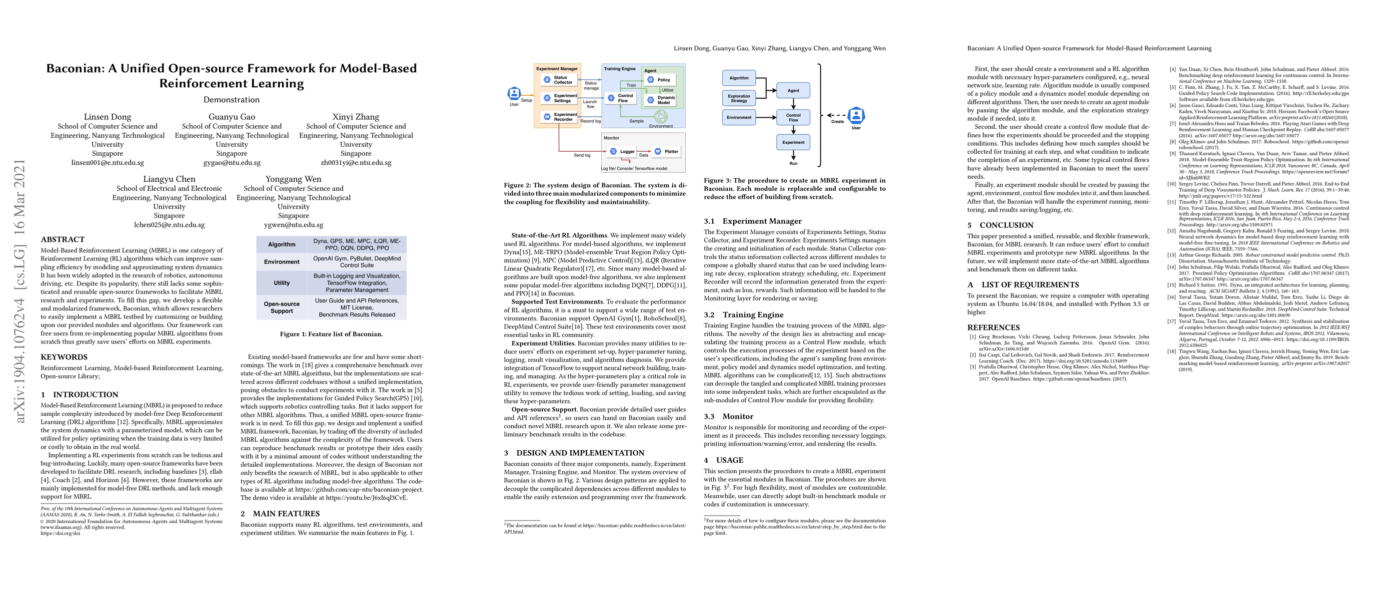 Baconian is a unified open-source framework designed to facilitate Model-Based Reinforcement Learning (MBRL) research by providing modularized and reusable components. It aims to save researchers' time by allowing them to implement MBRL experiments without re-implementing popular algorithms from scratch.
