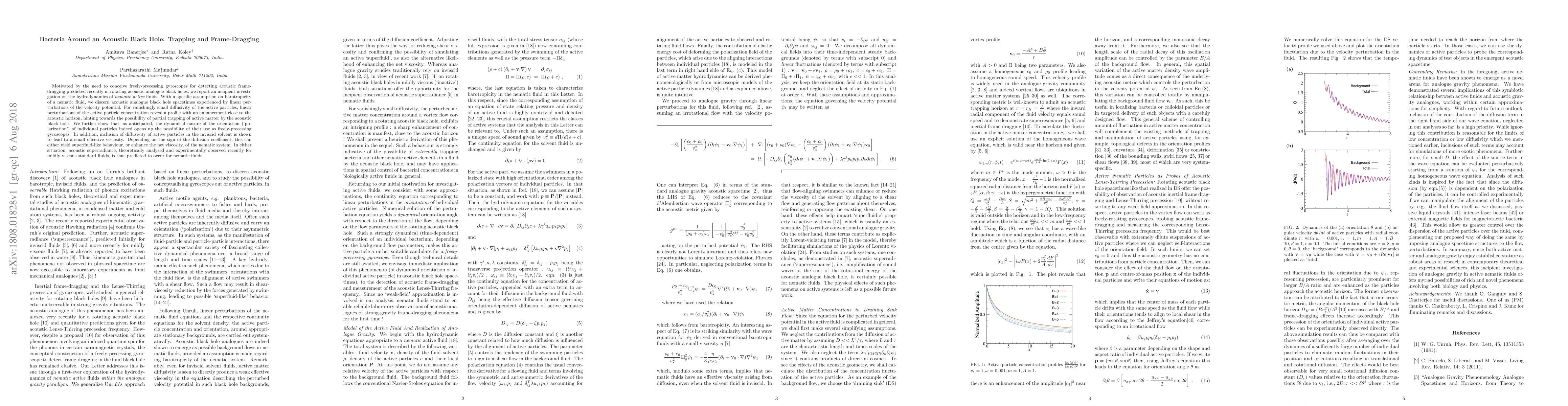 Motivated by the need to conceive freely-precessing gyroscopes for detecting acoustic frame-dragging predicted recently in rotating acoustic analogue black holes, we report an incipient investigation on the hydrodynamics of nematic active fluids. With a specific assumption on barotropicity of a nematic fluid, we discern acoustic analogue black hole spacetimes experienced by linear perturbations of the velocity potential. For vanishingly small diffusivity of the active particles, linear perturbations of the active particle concentration reveal a profile with an enhancement close to the acoustic horizon, hinting towards the possibility of partial trapping of active matter by the acoustic black hole. We further show that, as anticipated, the dynamical nature of the orientation (`polarization') of individual particles indeed opens up the possibility of their use as freely-precessing gyroscopes. In addition, inclusion of diffusivity of active particles in the inviscid solvent is shown to lead to a small effective viscosity. Depending on the sign of the diffusion coefficient, this can either yield superfluid-like behaviour, or enhance the net viscosity, of the nematic system. In either situation, acoustic superradiance, theoretically analyzed and experimentally observed recently for mildly viscous standard fluids, is thus predicted to occur for nematic fluids.