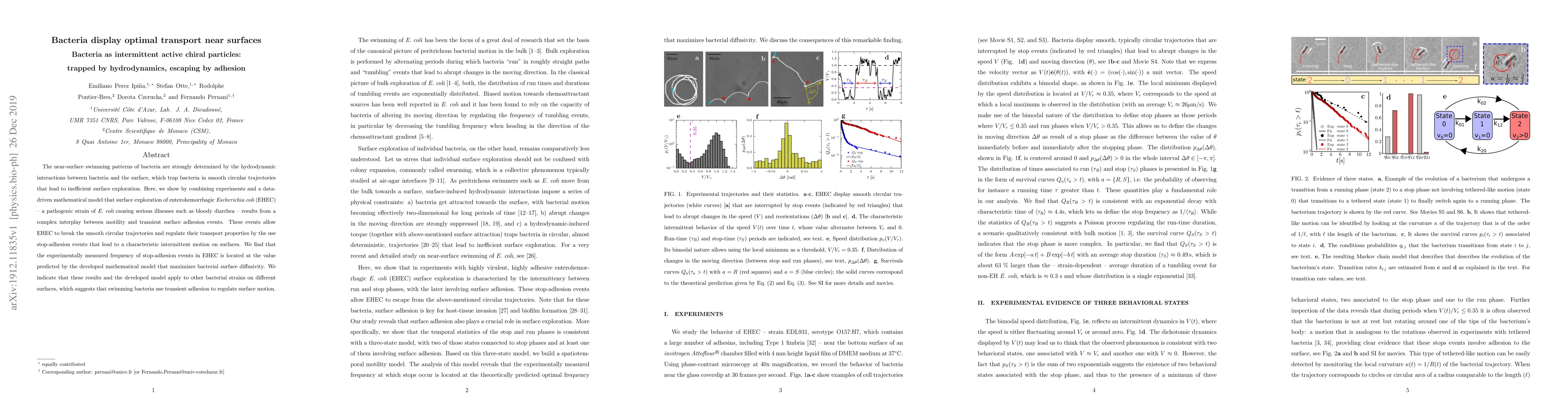 The near-surface swimming patterns of bacteria are strongly determined by the hydrodynamic interactions between bacteria and the surface, which trap bacteria in smooth circular trajectories that lead to inefficient surface exploration. Here, we show by combining experiments and a data-driven mathematical model that surface exploration of enterohemorrhagic Escherichia coli (EHEC) -- a pathogenic strain of E. coli causing serious illnesses such as bloody diarrhea -- results from a complex interplay between motility and transient surface adhesion events. These events allow EHEC to break the smooth circular trajectories and regulate their transport properties by the use stop-adhesion events that lead to a characteristic intermittent motion on surfaces. We find that the experimentally measured frequency of stop-adhesion events in EHEC is located at the value predicted by the developed mathematical model that maximizes bacterial surface diffusivity. We indicate that these results and the developed model apply to other bacterial strains on different surfaces, which suggests that swimming bacteria use transient adhesion to regulate surface motion.
