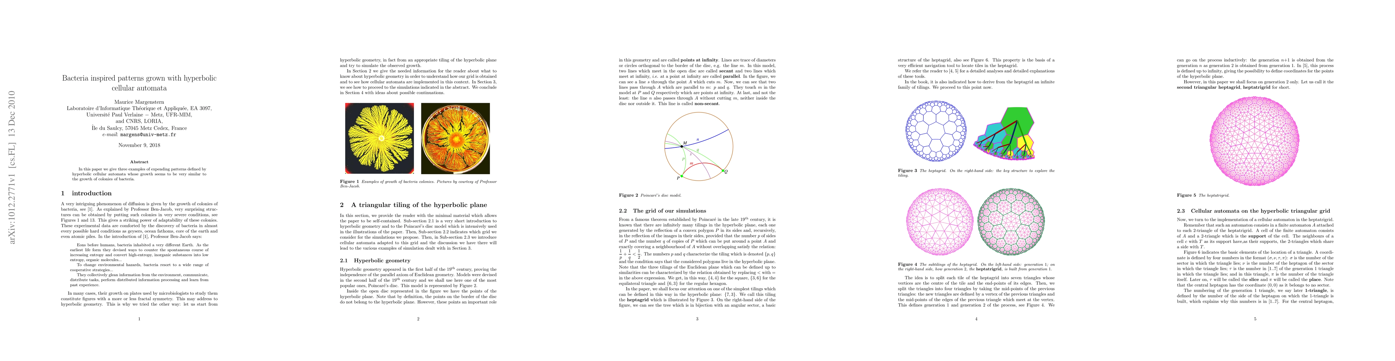 This paper explores the growth patterns of hyperbolic cellular automata, demonstrating their similarity to bacterial colony expansion through three specific examples. The study highlights the potential of these mathematical models to mimic biological growth processes.